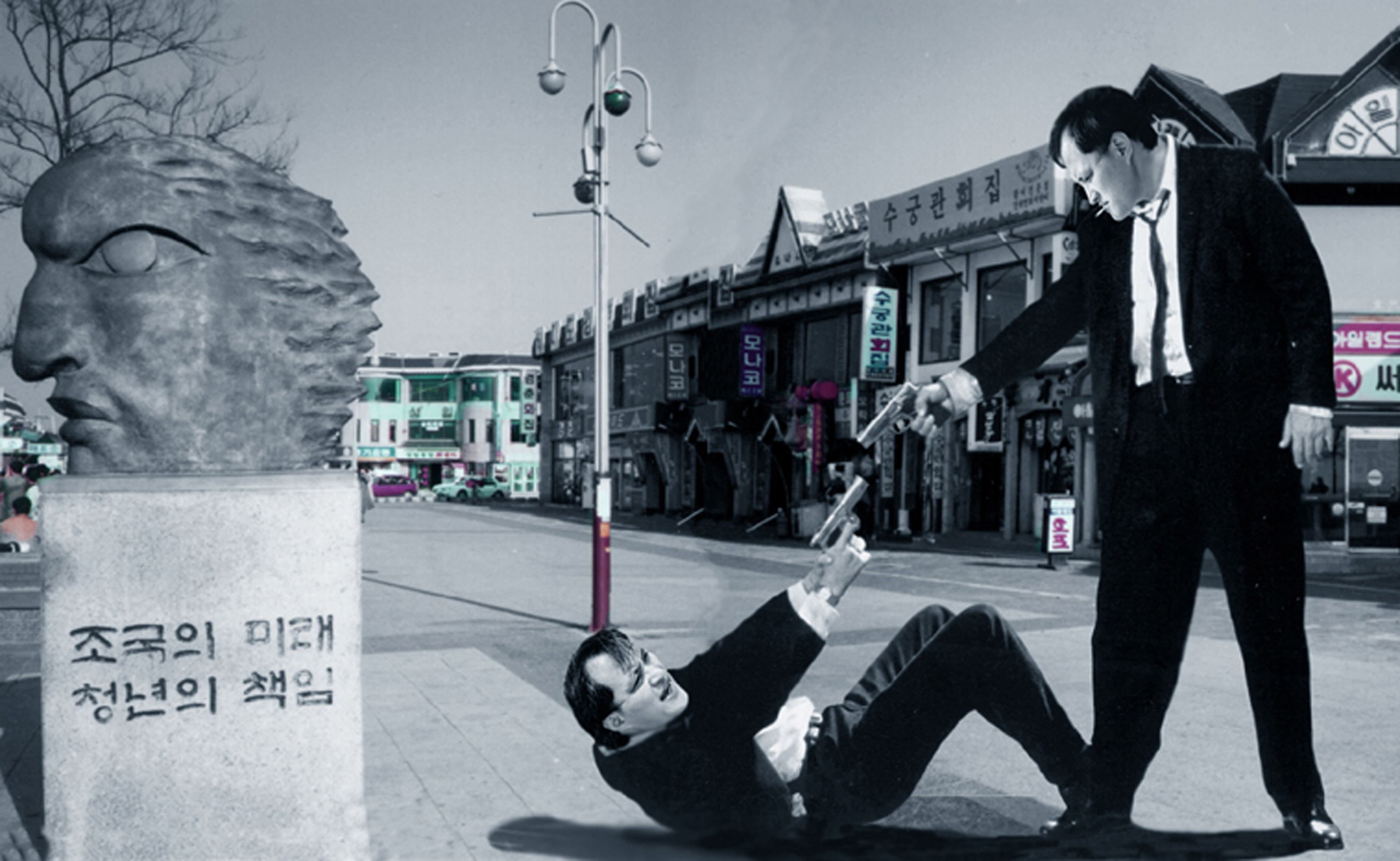 The Fugitive series originated from the artist's sense of indebtedness to the Gwangju Uprising. The artist, who was on the island on May 18, 1980, witnessed the devastating reality in Gwangju, which he later visited. After witnessing the scene that still bears the marks of that day, the artist confessed that he wanted to run away from this terrifying history, from a kind of power, and felt helpless as an individual. Afterward, Kang synthesized his own image with the staged scenes, and expressed himself as a fugitive running away from the brutal situation in his series of works.