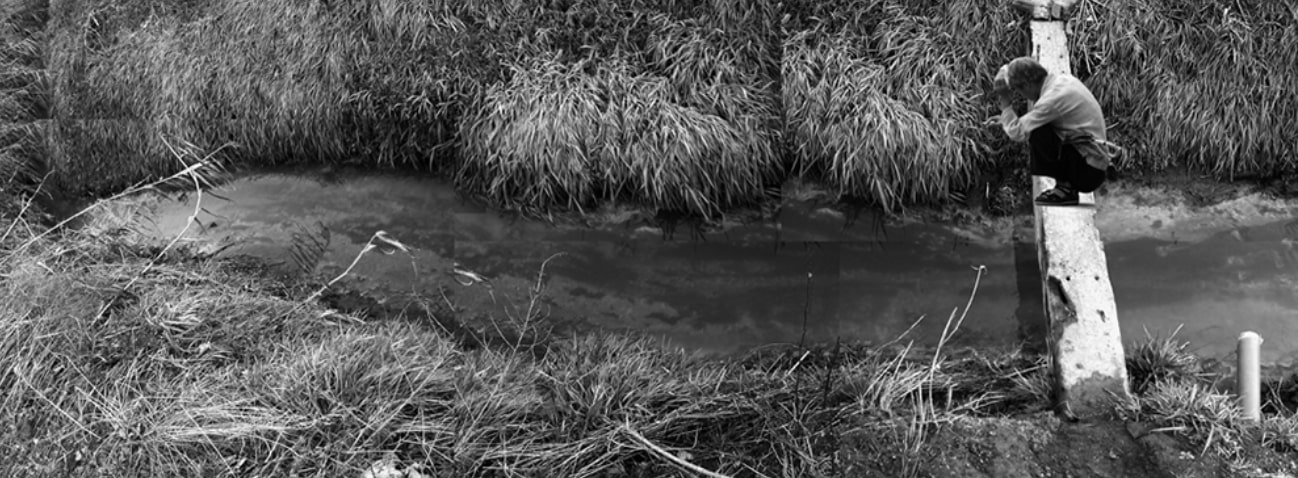 Greenbelt – A Lofty Scholar Contemplating Water (1999-2000) is a black-and-white photograph of a stream in the greenbelt polluted with garbage and wastewater and a man looking down on it, contrasting with the work's subtitle, A Lofty Scholar Contemplating Water by Kang Huian from the period of Joseon Dynasty. While the original work depicts a nobleman enjoying nature and gazing at the clear water, Kang's image shows a man looking down at the polluted waters of the greenbelt with concern.