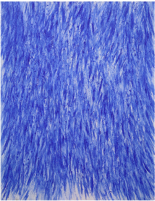 The repeated layering and erasure of blue and white generate a dynamic rhythm across the surface. Countless lines and planes accumulate, dissolve, and re-emerge, creating a tension between intentional control and contingency. This repetition is not merely a formal gesture; it is the trace of bodily duration, a record of the artist’s breathing and movement over time. The canvas thus becomes less an image than a temporal field in which action and presence are sedimented.