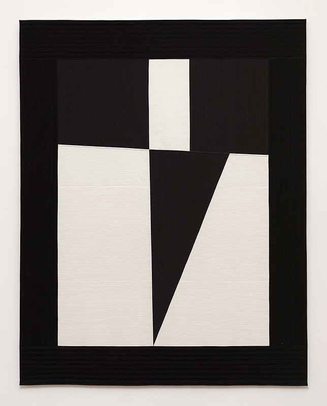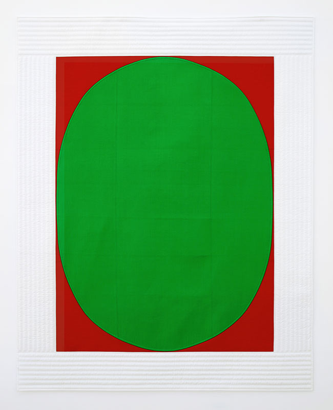 These four doors are respectively made up of two frames, and each has a semi-circular cutout, a sort of a half-moon or section of the moon that evokes the image of a star seen at night through the openwork shutters of a room within a house. If Seulgi Lee’s blankets tip our bodies into sleep and dreams, these painted doors oddly tip our bodies into the metaphorical space of a room, the intimacy of a night in search of, as the artist tells us, “the rabbit in the moon.”