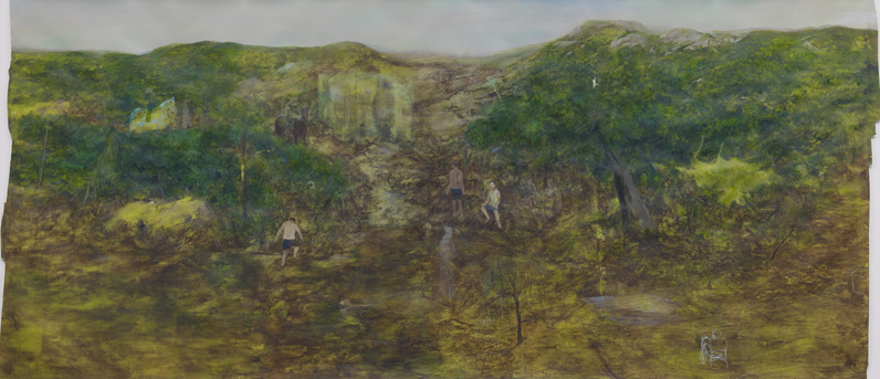 Sejin Park, Valley, The Never Dying Bandits,2013, rose, acrylic, ·glue on paper, 150×348cm © Sejin Park
