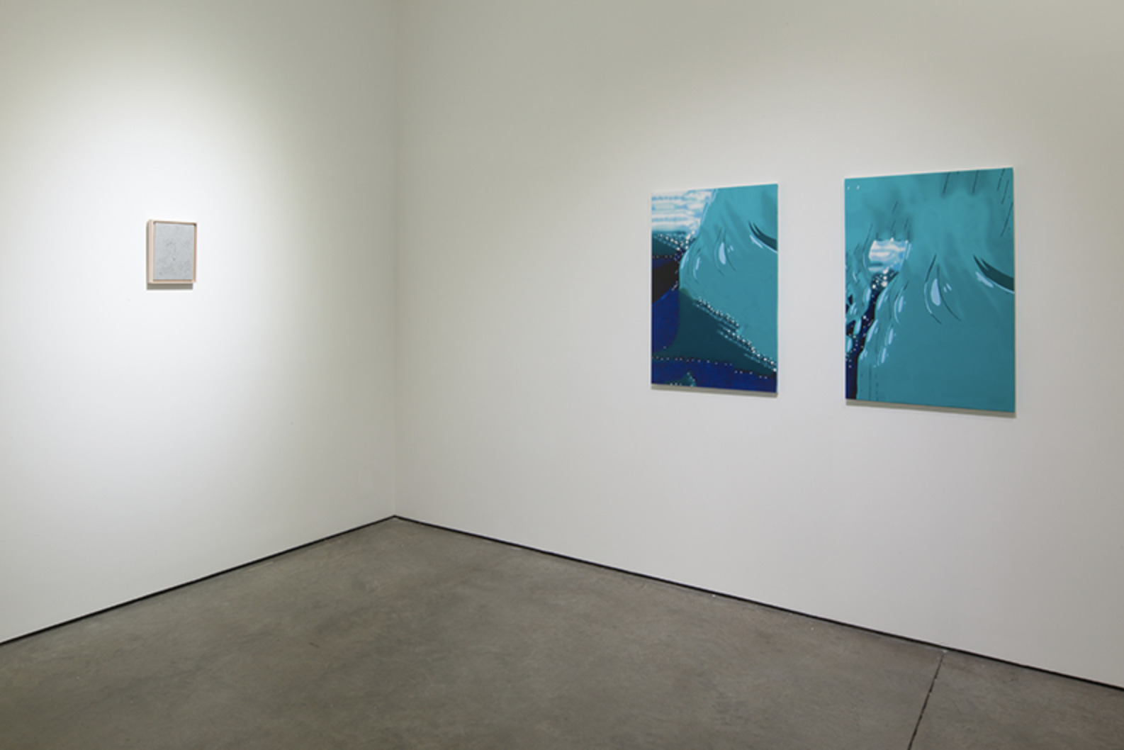The original medium that spurs these paintings into existence are scenes from a popular Japanese shōjo manga­­­­1 where the protagonist emits beams of energy or aura at times of transformation and combat. Yoon makes the original imagery unrecognizable by filtering it through two separate steps of digital editing and then transcribes it into painting. This process starts by isolating the selected scenes using the screen-capture function of the computer. The isolated images are then “expand-cropped”2 via Adobe Photoshop, a digital graphics editing software.