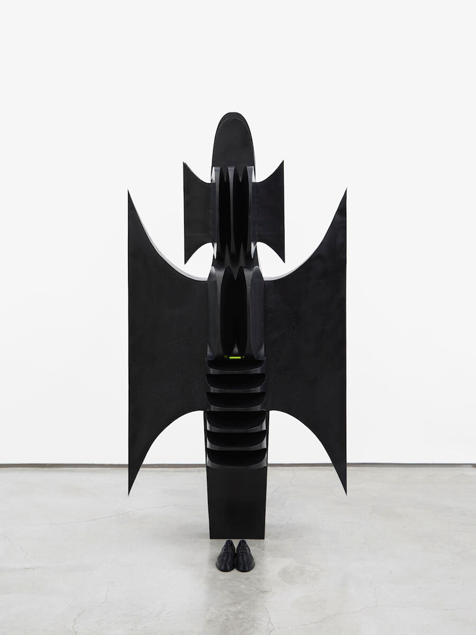 Hwang Sueyon, Black Effector, 2023. 3D print, lighter, printed paper, effect spray, glitter, 240 × 109 × 78 cm. ©FRIEZE