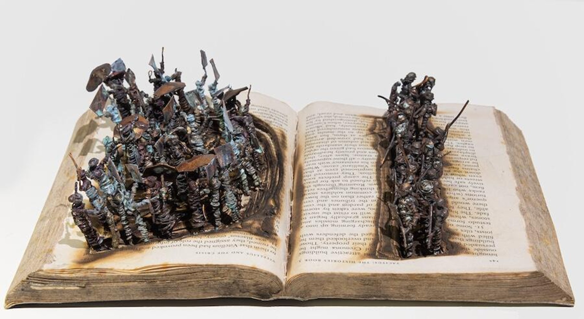 Kingsley Gunatillake, War Text, 2023. Used books and copper model soldiers, 19 × 22 × 6 cm.  ©FRIEZE
