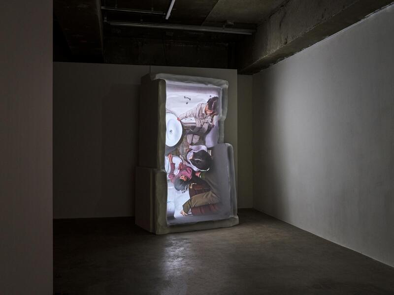 Nayoung Kang, Local Rule: Bathroom, 2024, single channel video (colour / 2-channel sound, 5”27’, loop), polystyrene block, expanding foam, putty, soap, toothbrush, 130x78x220(h)cm, Installation view of 《Heavy-Duty》 (CR Collective, 2024) ©Nayoung Kang