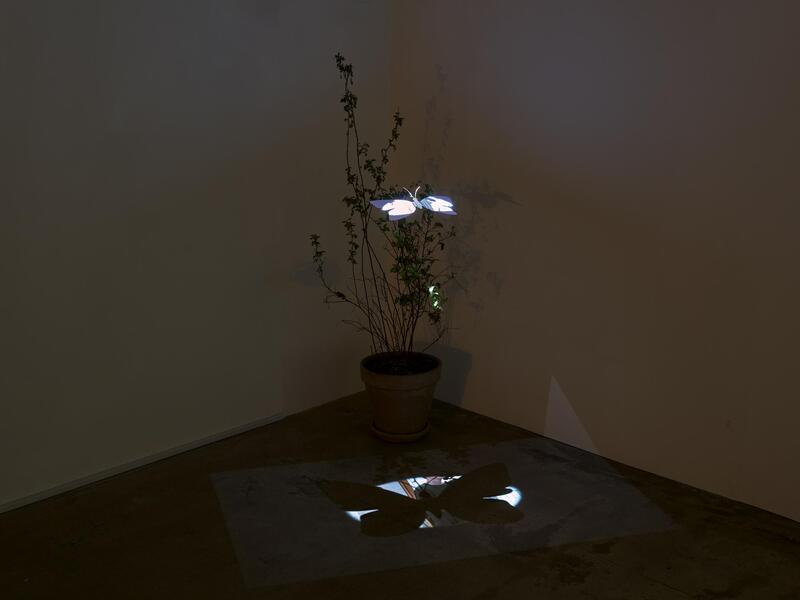 Nayoung Kang, Balancing Butterfly, 2024, single channel video (colour, 2”17’, loop), pot, paper, dimensions variable, Installation view of 《Heavy-Duty》 (CR Collective, 2024) ©Nayoung Kang