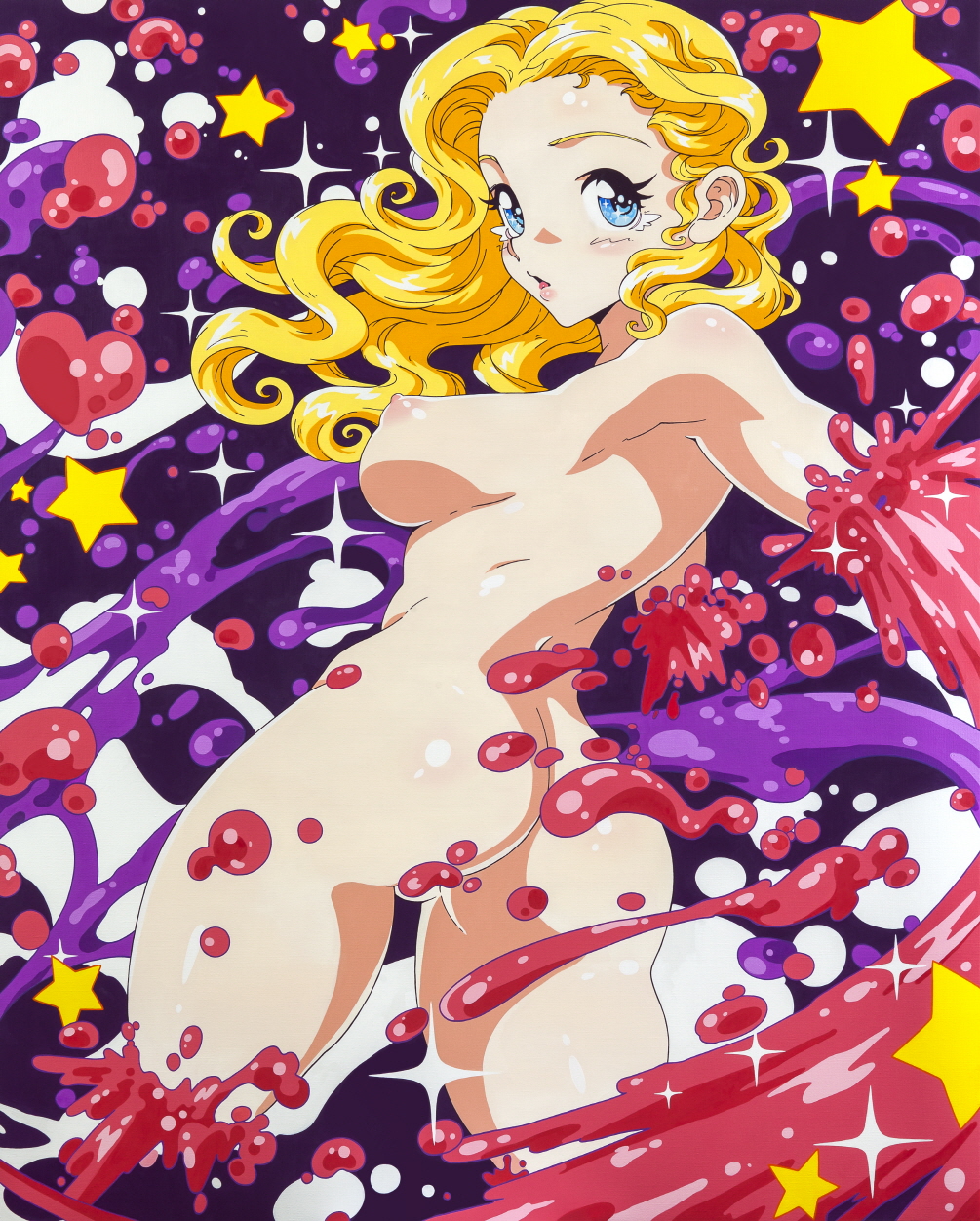The whirlpool of spurting blood and body fluids accompanied by the sparkles and stars characteristic of manga/anime becomes the focus of this series which contemplates on the limbless torso forms of ‘Moepretty girls’, and this creates a particular painterly time space, interconnected with the poise and movement of the body.