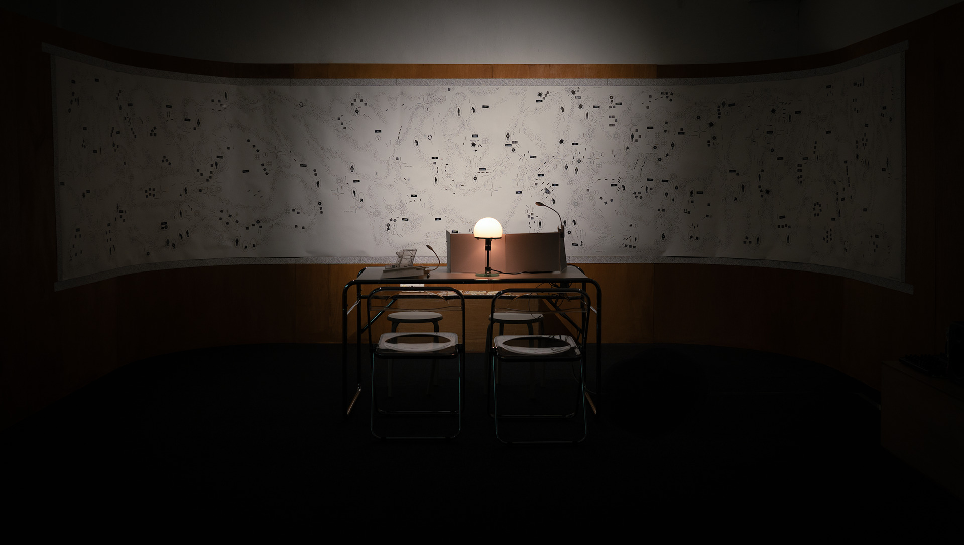 offstage, and the map as an interface relaying the stage all make visible an