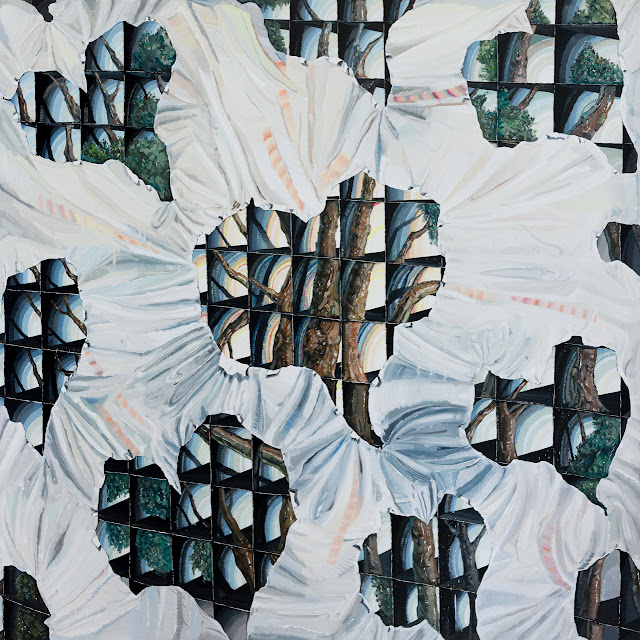 In this exhibition, the artist expresses geometric and dimensional forms by repeating fragments he remembers—such as trees, figures, gaps, fabrics, and sketches—in square “pixel” patterns. Whereas he previously used to stack images flatly upon the surface, this time his multilayered experiences accumulate in a more spatial dimension, weaving images in which the temporality of perception has been dismantled.