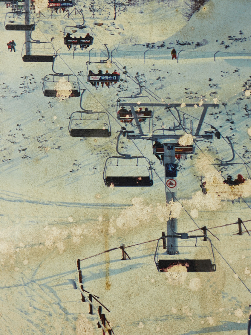 Furniture and ski equipment inside the buildings, covered in dust like well-preserved mummies, seem to announce the belated arrival of guests. Collapsed ceilings, unable to withstand the emptiness, and walls that hold only traces of what once was, point to time that has already passed. Meanwhile, materials left as if construction could resume at any moment, relatively intact outer walls, and a recently repainted lift gleaming on its own seem to indicate a time yet to come. Within the ruins, we experience a peculiar photographic time-space in which the past is summoned into the present and a future remains suspended.