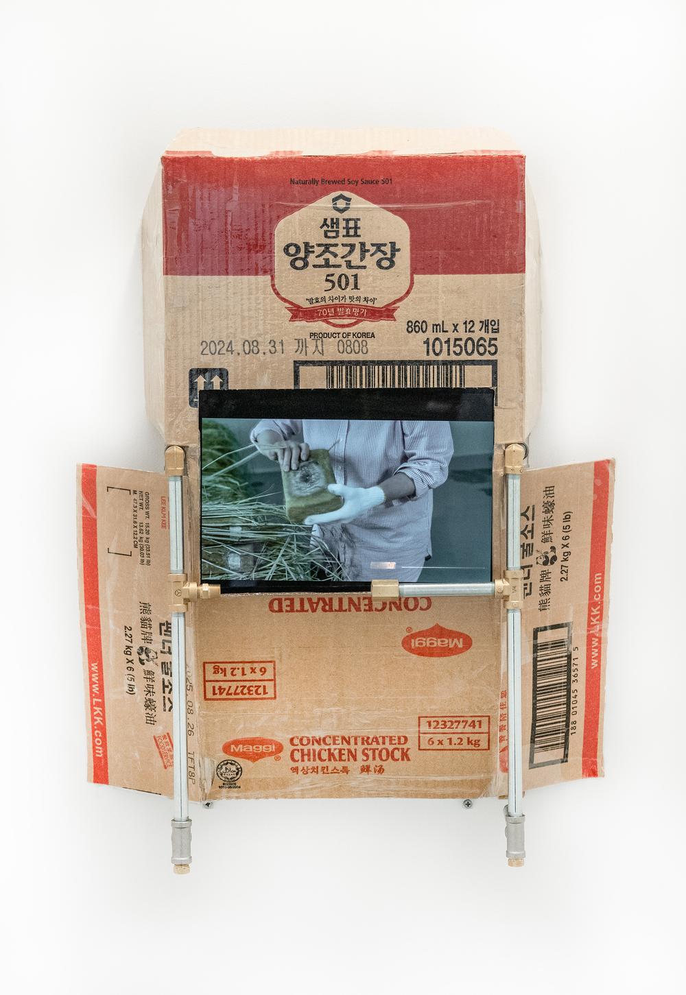 At the back of the gallery, Checkmate (2021) is installed as a standalone video work accompanied by cardboard boxes. The AI-generated narration explains the origin of the tea “Bai Hua”—which Queen Elizabeth II once referred to as an “Oriental Beauty”—and then shifts to scenes of female workers in a soy sauce factory filling and packaging bottles. At the stage where soy sauce bottles move along the conveyor belt, completing their filling and packaging, the sauce’s complex origins have already been diluted and diminished by branding and Orientalism. Yoo’s allegorical factory quietly exposes the violence of the market within a confined scale, as the intensifying scent gradually saturates the space over time.