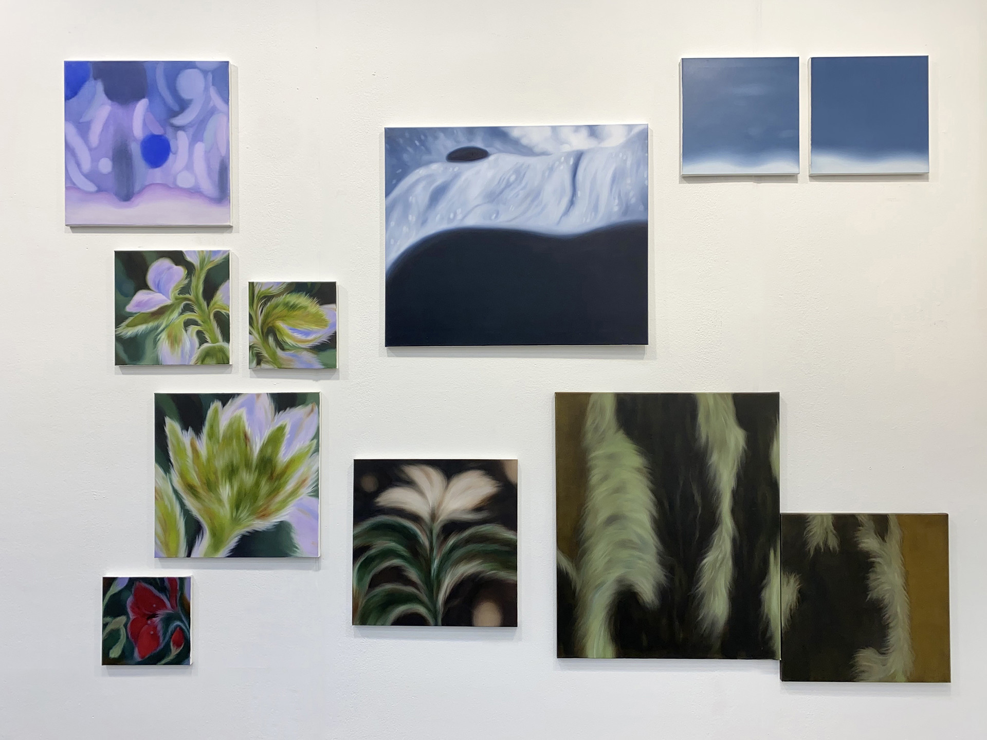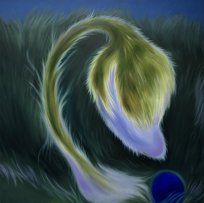 The landscapes in her works depict intimate encounters among humans, animals, plants, and minerals through tactile and immersive surfaces. The sensorial, organic forms within the paintings metaphorically reflect aspects of human existence and life, coming together to form images of new ecosystems.