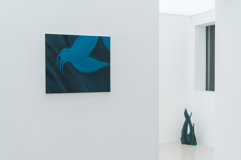 Greem Kim’s second solo exhibition, 《Nesting on a Blue Night》 (Sueno339, 2025), originated from her observation of a bird building its nest while she was studying the life of the forest. The artist captured on canvases of various sizes the ceaseless fluttering of a blue satin bowerbird constructing its nest deep within the dark forest, tirelessly working day and night.
