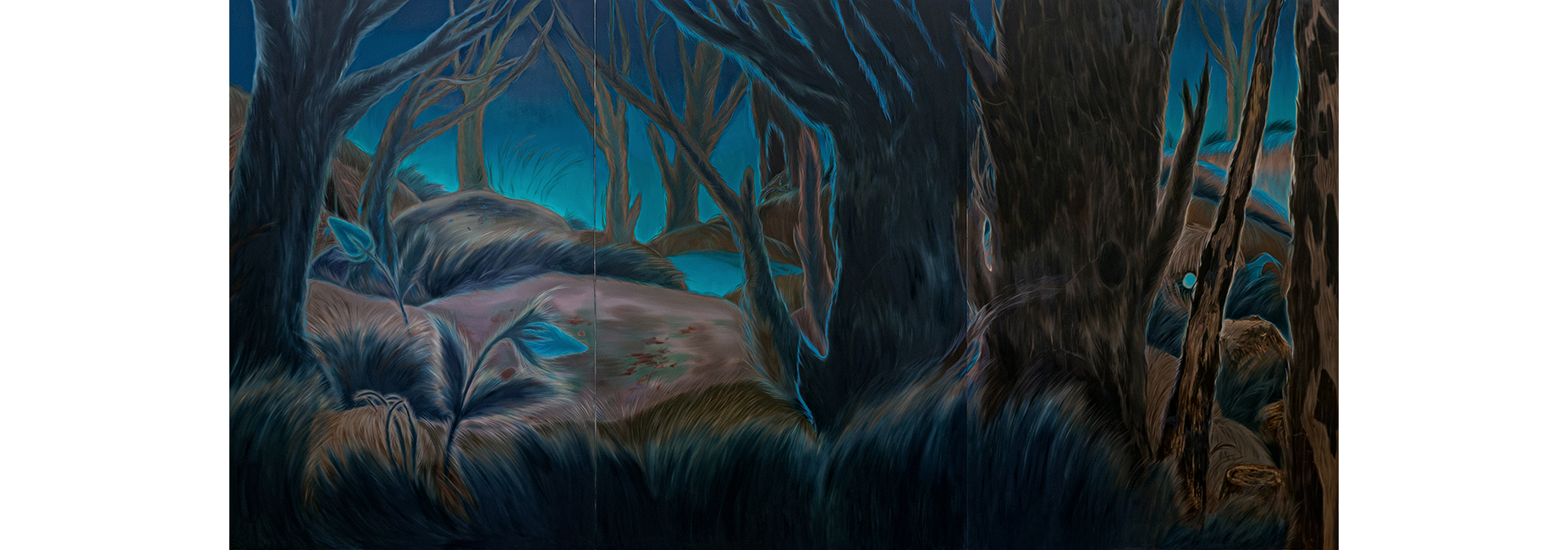 Within these works, flexible lines lurking in the forest landscape, the fractures in perception they mediate, awareness of a decentered subject, the bodily rhythms hovering at the edges of reality, and the opposition or connection among these entities together construct a nonlinear world that envelops the viewer.