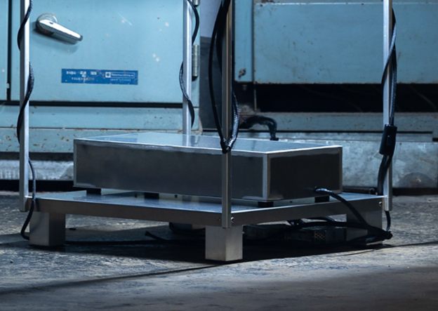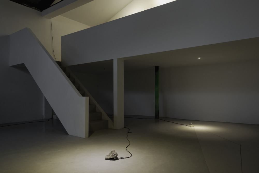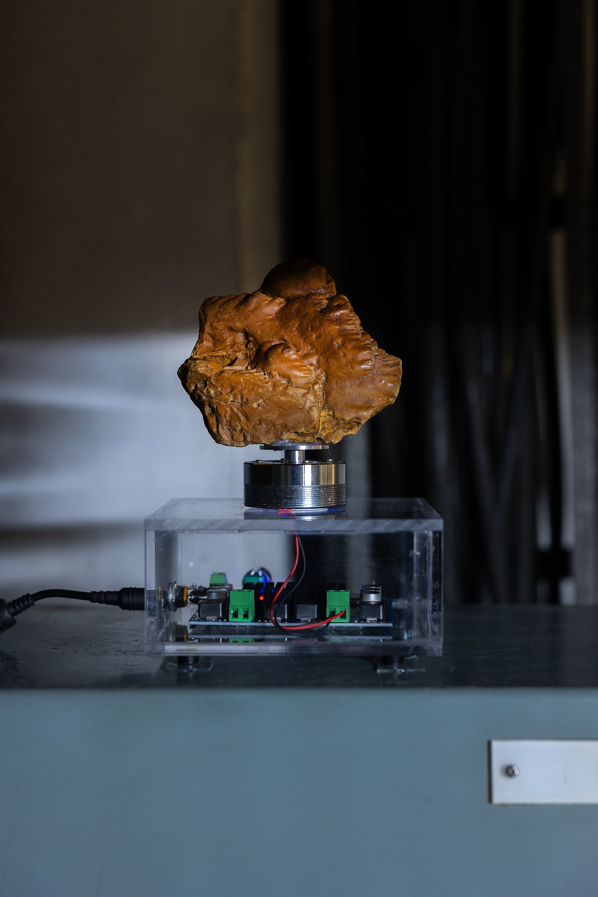 Seo Minwoo, small rock Generator_Harsh, 2023, Stone, exciter, amplifier, acrylic, 150 × 135 × 125 mm, 4'08". Photo: Ahina Studio ©Seo Minwoo