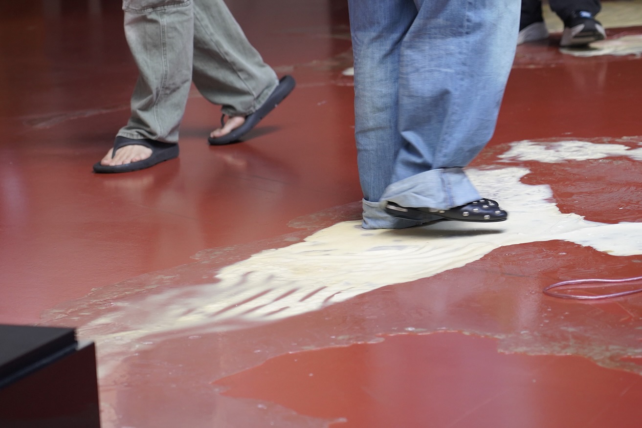 In the subsequent performance 《Slough and Trajectory: Trajectories》, the event of listening expanded into the bodily realm. Latex covering the entire floor of the venue functioned simultaneously as a surface that received sound and as a medium that recorded it. As audiences walked, stepped, and hesitated upon it, they left behind their own traces.