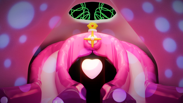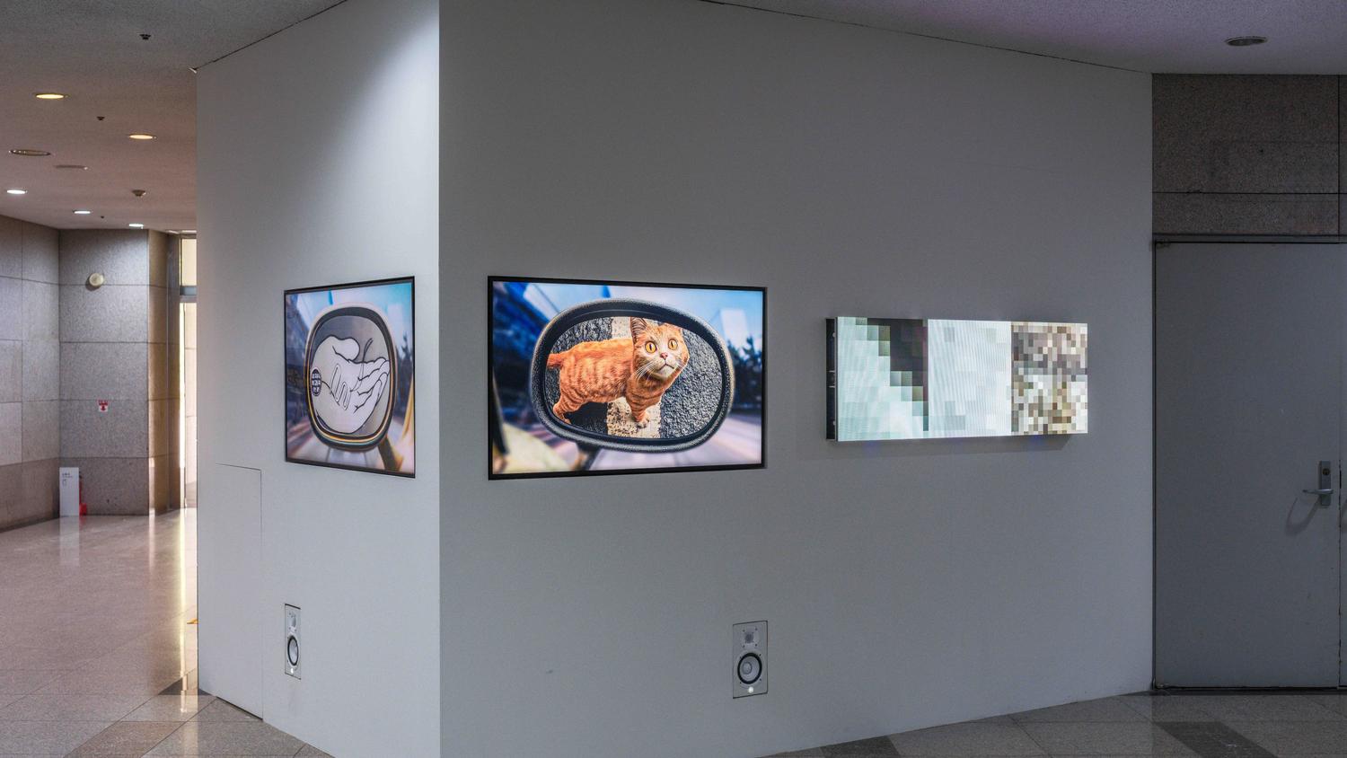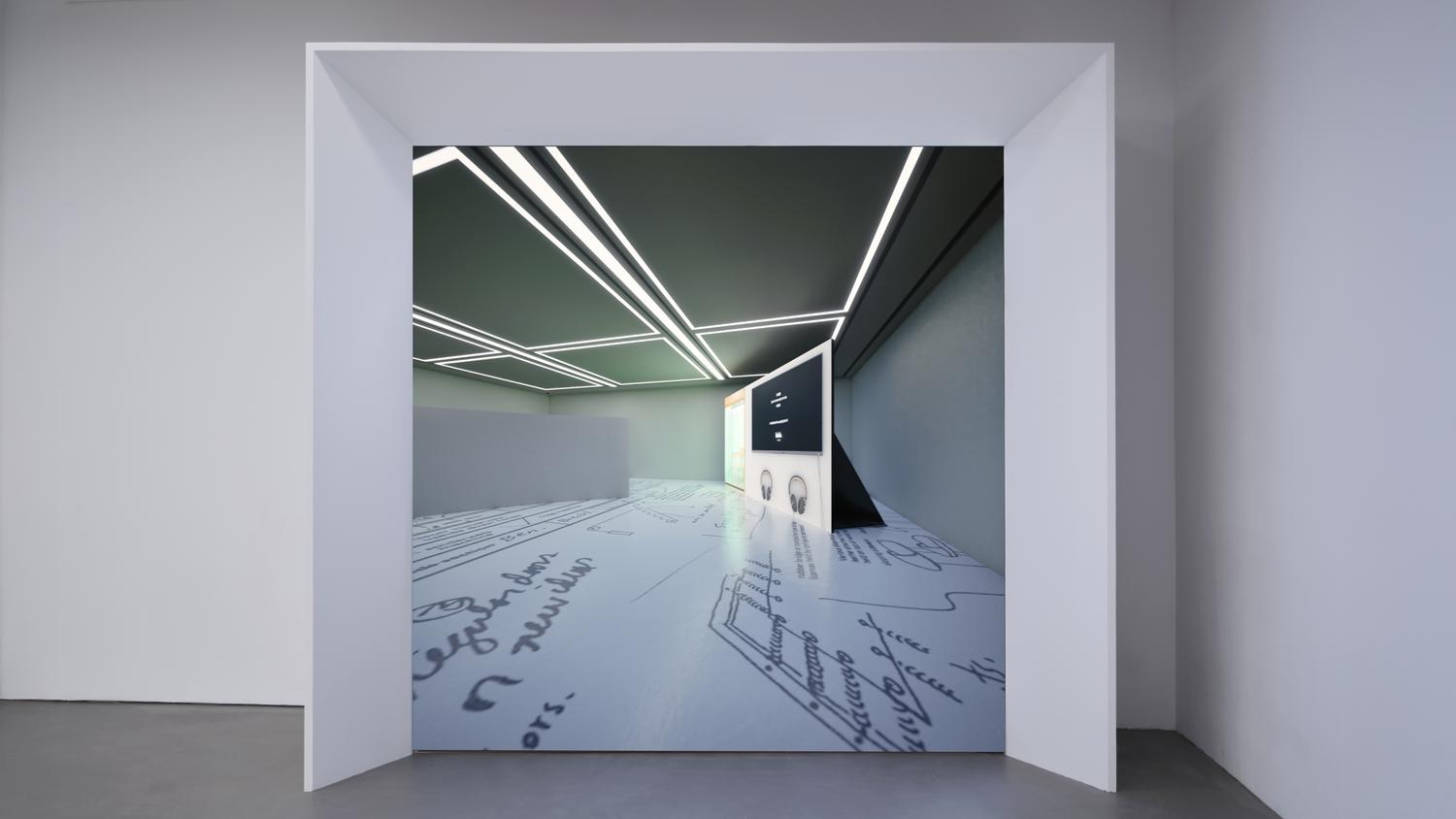 The video leads from the gallery entrance to the setting of a different virtual exhibition, passing by previous video works by the artist on the way-including The truth is the one that is masked (2021) and Time Shifting Box (2022)-along with archival materials from her 2024 solo exhibition 《DIZZY》.