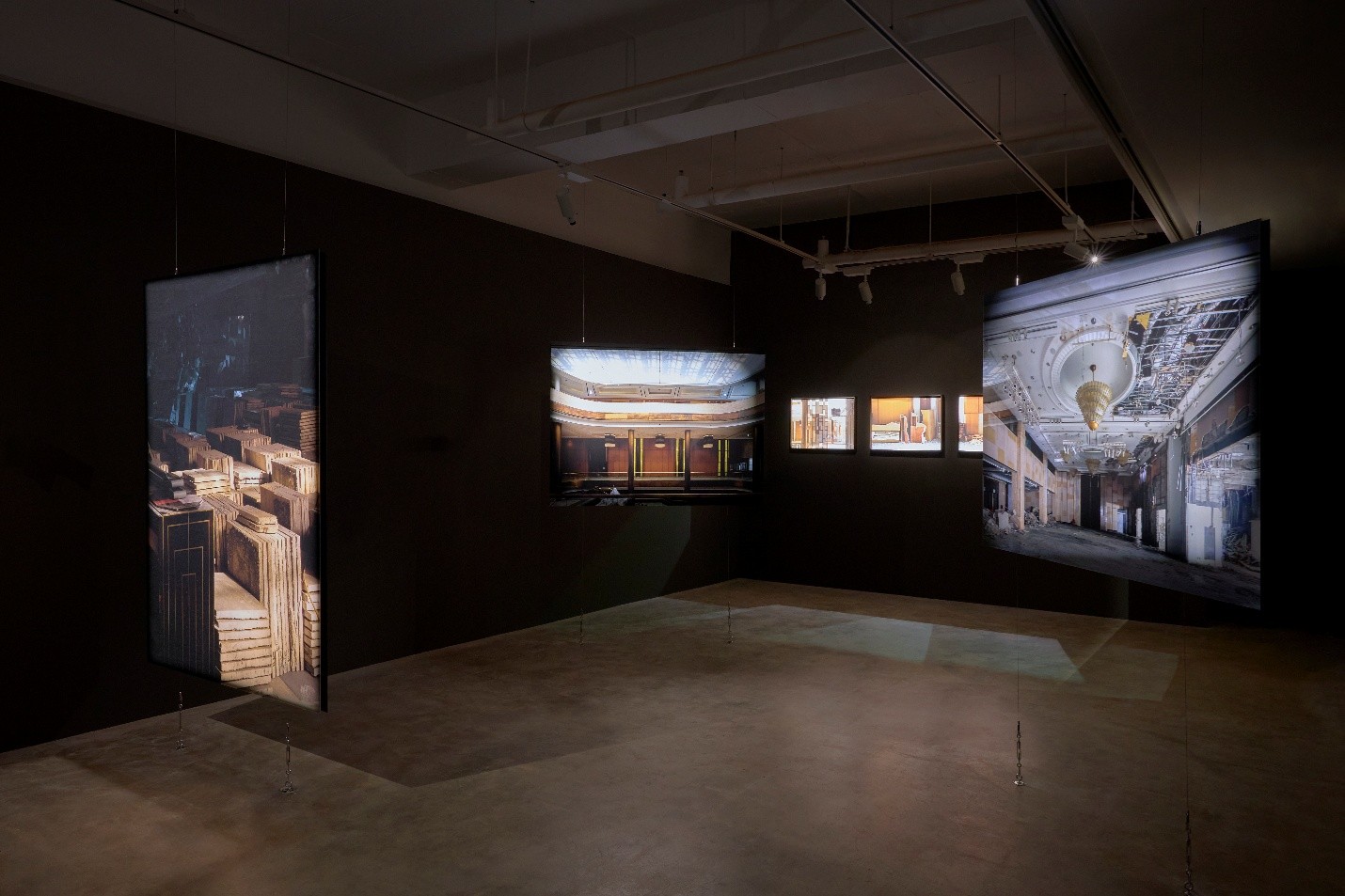 The movement of the video traverses the theater, intersecting the stage as a physical space with archival records that remain as immaterial data. In doing so, the work resists a linear flow of time and instead evokes a new sensibility generated through the collision of multiple temporal layers.