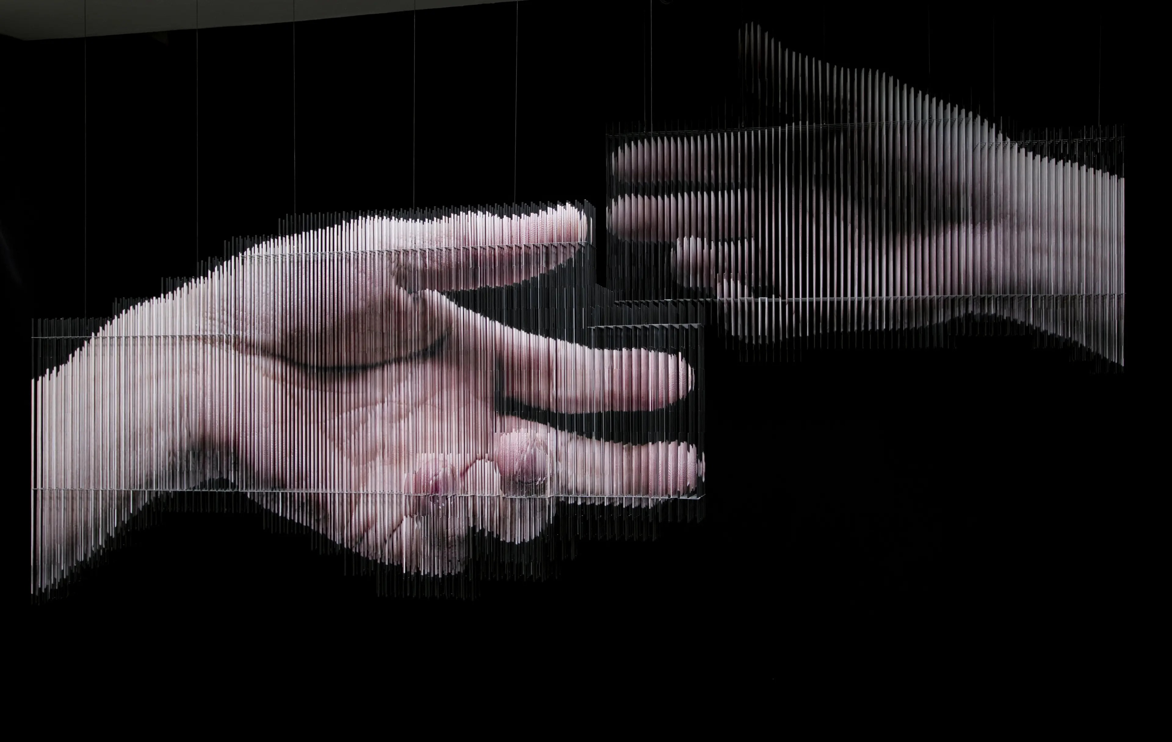 After that, he produced three-dimensional installation works in which images of body parts or objects were printed in earnest using strings.