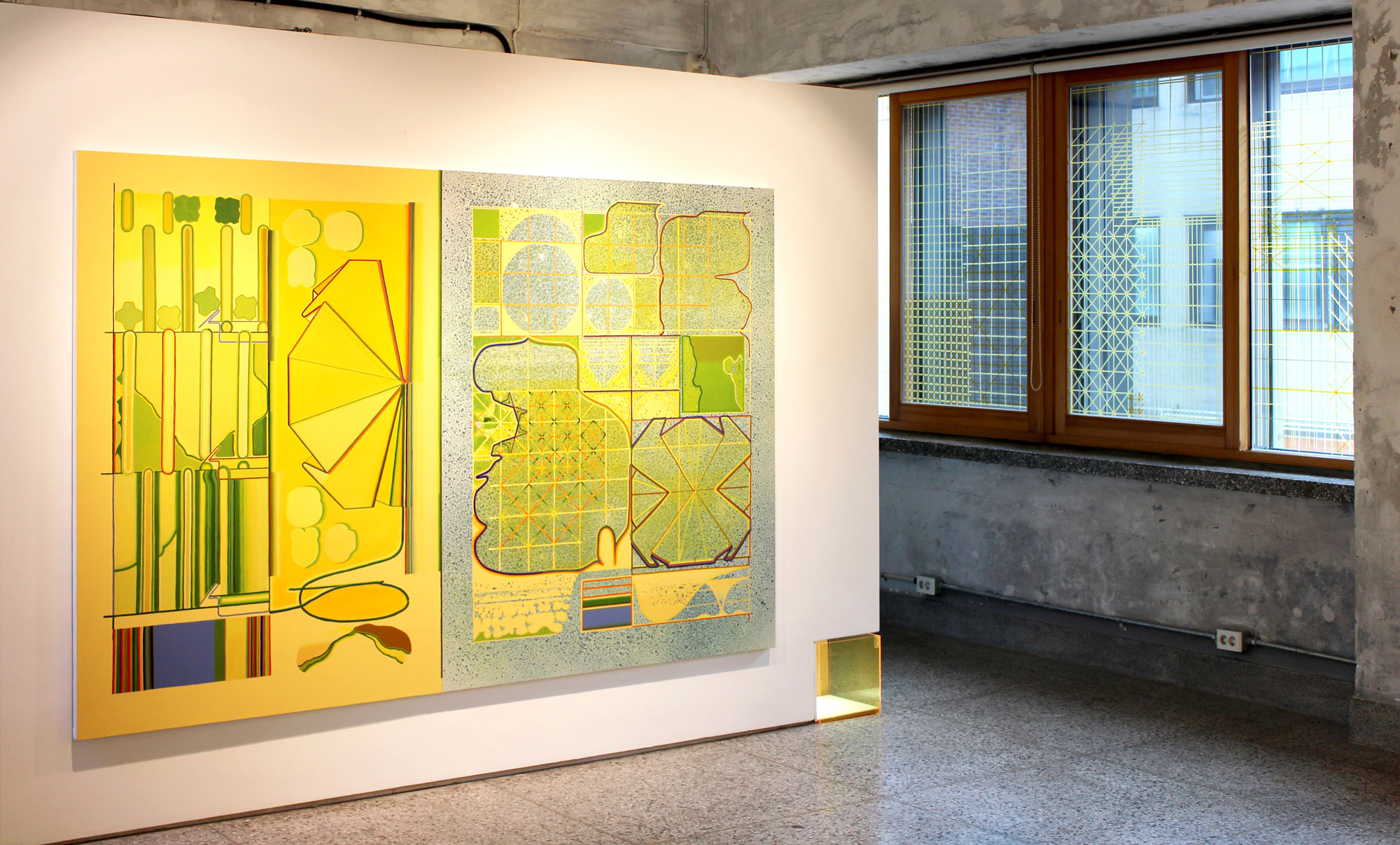 In the perspective of the space, meanwhile, the scene that a series of x made up of various colours and lines coming out from the canvas and connected to the windows and wall is quite appealing. How the unit of painting is divided? How the modules of exhibition as the object of appreciation arithmetically relates to the physical sum of each painting? How the world in general and a specific painting are possible to connote or infer to each other? Curiously, a building under the construction is seen over the window during the exhibition period; tapes are attached in the shape of diagonal x on the window of the building to show the presence of glass, as usual. x represents the interior of painting’s frame is a blocked surface which does not penetrate the world, but at the same time it is a index alerts the presence of the world beyond the frame.