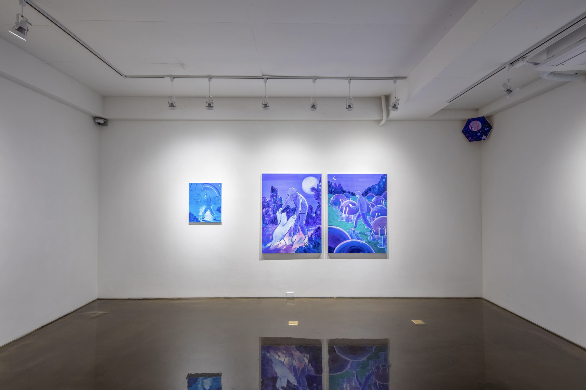 around graves staged beneath a crescent moon. In Yoo’s blue paintings, reality