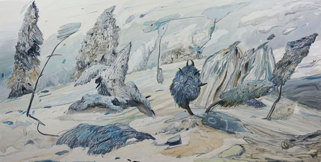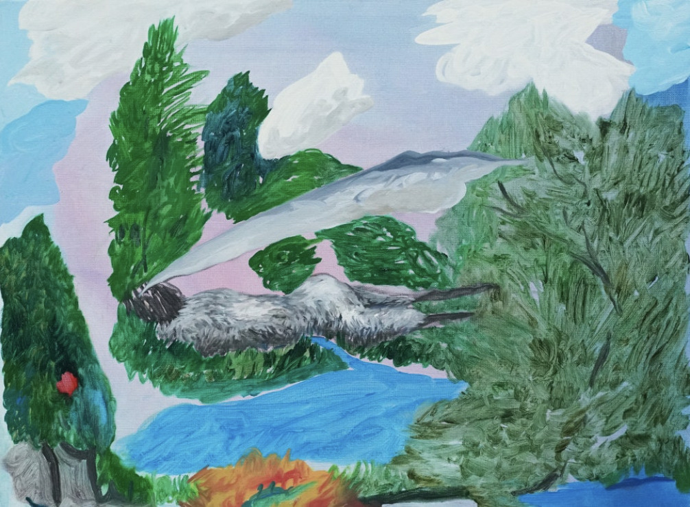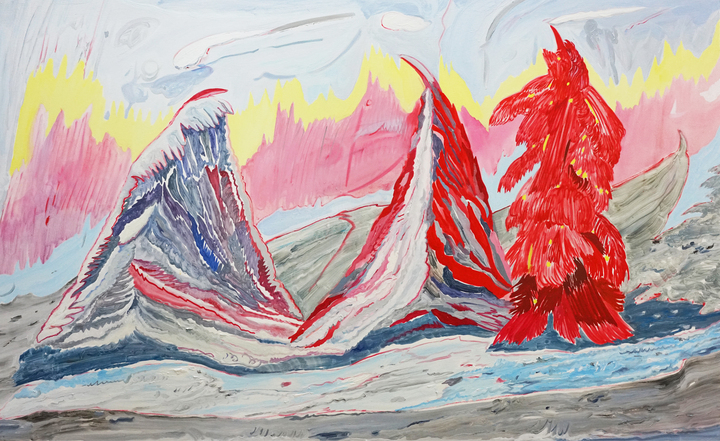 At first glance resembling landscapes, her scenes stage uncanny phenomena such as explosions and the emotional turbulence of figures caught in swirling unrest, all set against nature as a backdrop. The works presented in the exhibition depict entangled tableaux in which combustion and eruption—manifested through images of fire—intersect with gestures of escape, evasion, and defense mechanisms, symbolized by spaceship-like forms.