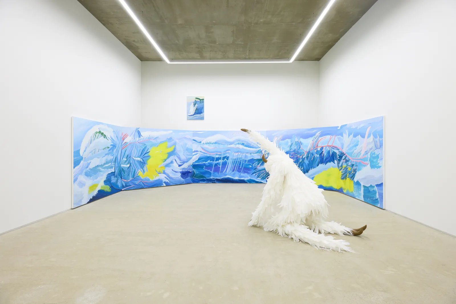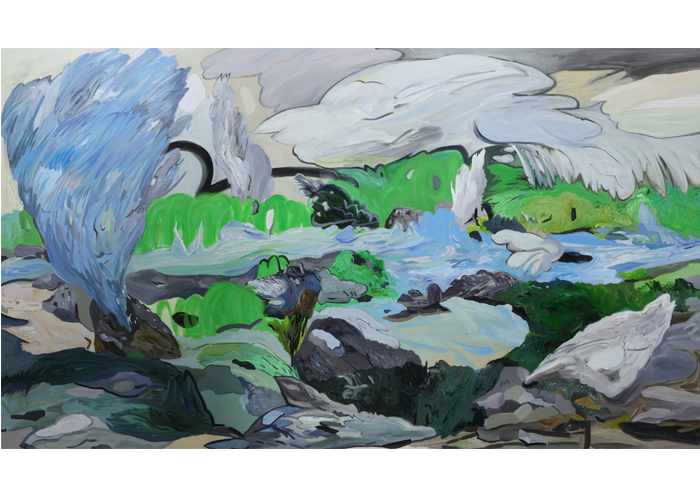 The furry creatures that appear within her paintings symbolize the defensive psychological attitudes that surface in relationships with others, while the exaggerated, unrealistically stretching volcanoes and clouds resonate with the artist’s own unstable emotional states. The natural environment surrounding the subject is not merely a depiction or representation of nature as landscape, but rather embodies a sense of place in its most instinctive and organic condition.