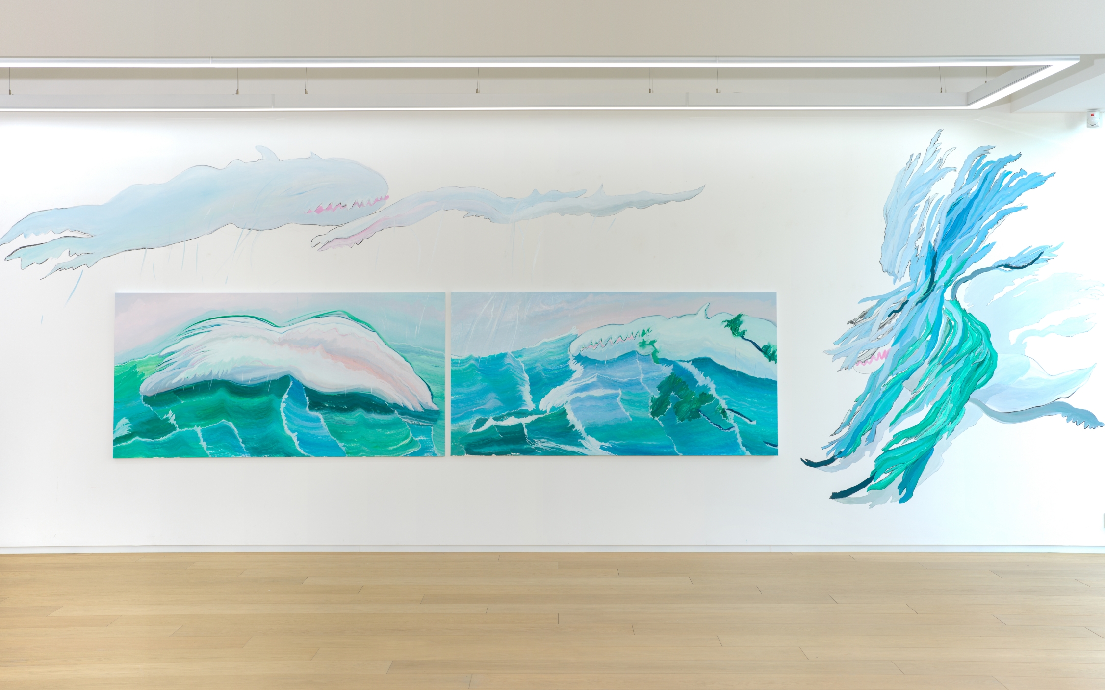 The waves depicted in the artwork He Gives Me Butterflies. love, which shares the same title as the exhibition, engage in an affectionate act of embracing each other. Amidst the center of the world, their relationship overflows with love, allowing us to infer their emotional distance. We confront both truth and exaggerated gestures, witnessing emotions being candidly exposed, as well as occasionally discovering movements veiled by falsehood.