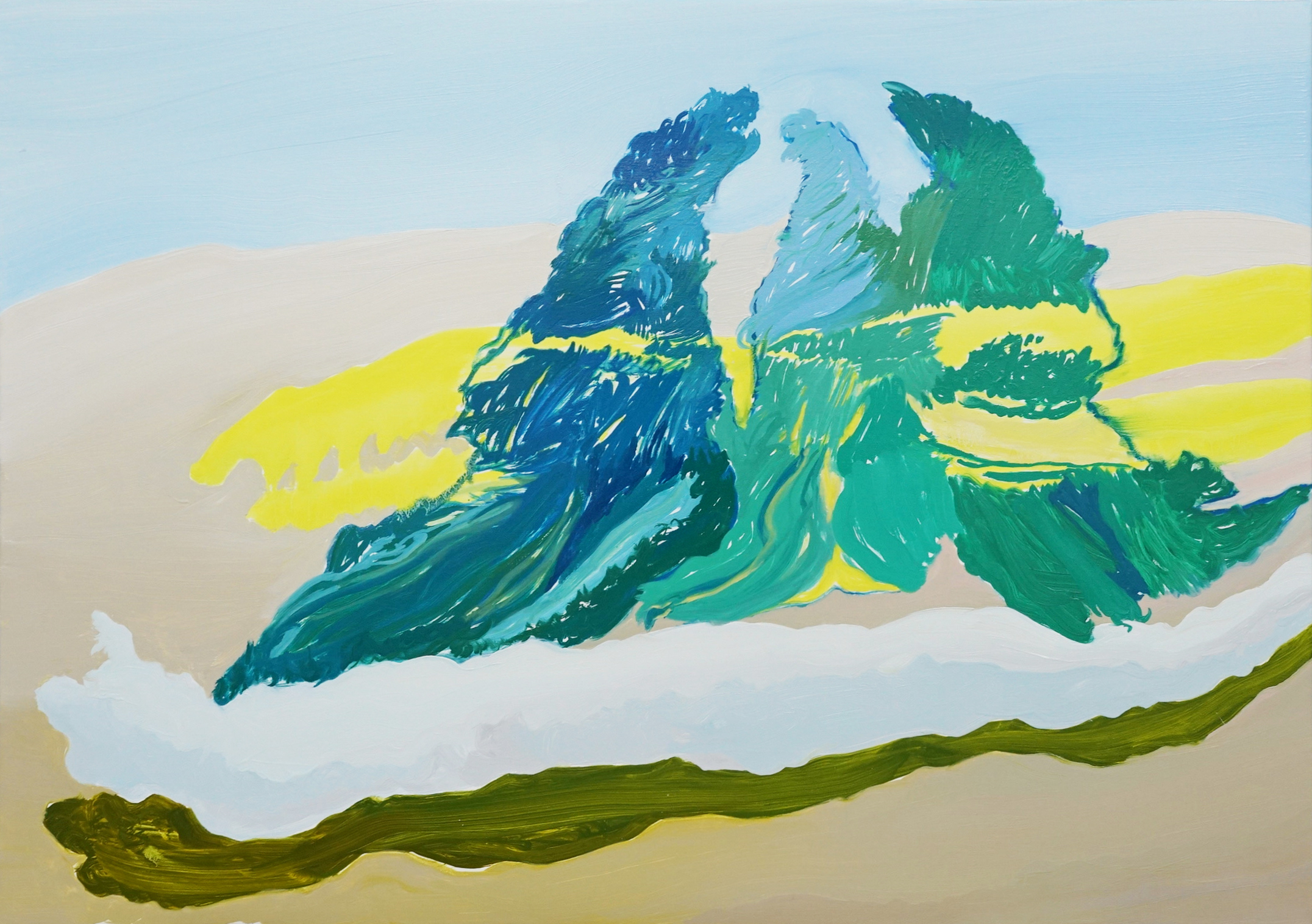 The artist has remarked, “At a certain point, the hells or states of confusion I painted in dark colors began to feel deeply hypocritical.” As a result, Yellow Mood appears bright, almost like a scene from a party, yet it is simultaneously “angry.” Likewise, An Angry Mountain, despite its lush vegetation reminiscent of a mountain flourishing in early spring, emerges as an enraged presence, sprouting hook-like horns from its form.
