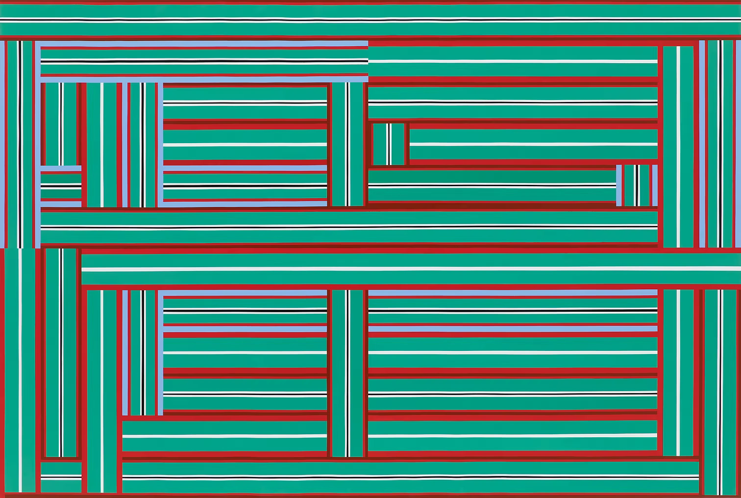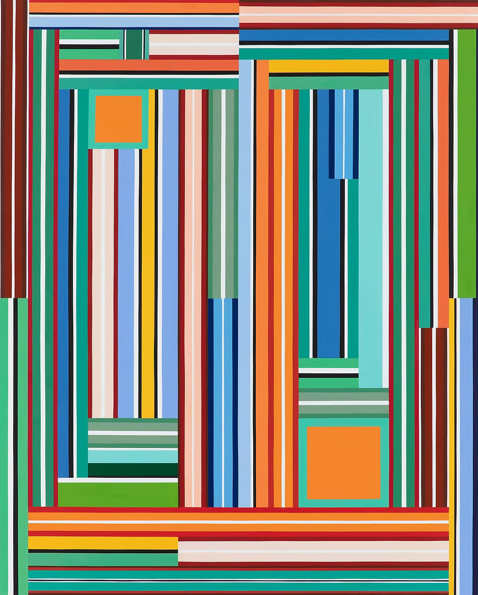 Another characteristic of these works is the emphasis on fundamental elements of vertical and horizontal linearity, combined with strong complementary color contrasts. Through this approach, the compositions achieve both a dynamic sense of color balance and visual harmony.