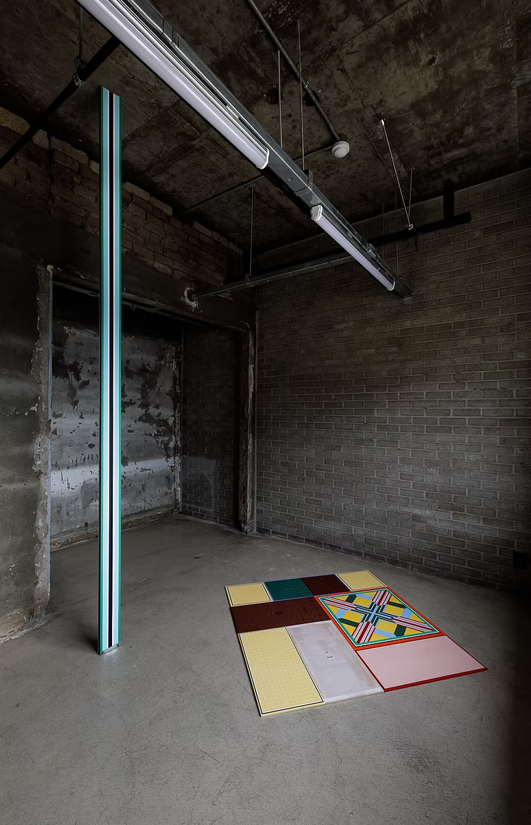 In addition, the floor installation Flat Pieces (2021) combined mass-produced tiles bearing simple traditional motifs with the artist’s canvas works, creating a new sense of site-specific presence within the rough concrete exhibition space.