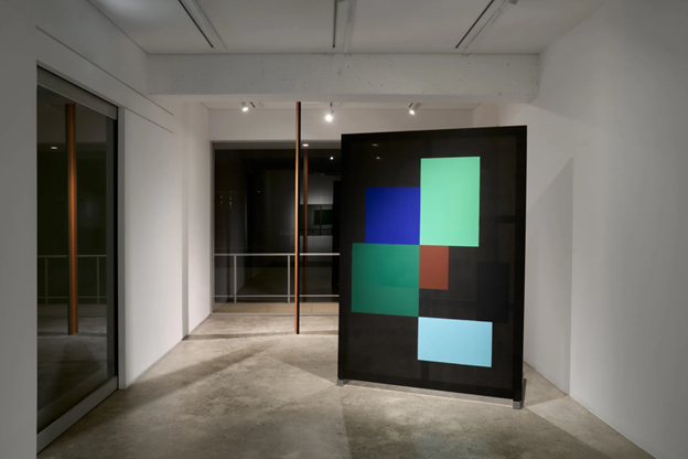 In this exhibition, the artist employs ink as her primary material. Through repeated processes of dyeing linen with ink, washing, and layering pigment, the surface gradually acquires a density of darkness. Yet this darkness does not conceal or obscure; rather, it clarifies form. The grain of wood permeated by ink becomes more distinct, and the light passing through the interstices of woven fabric subtly accentuates the structure of the canvas frame.
