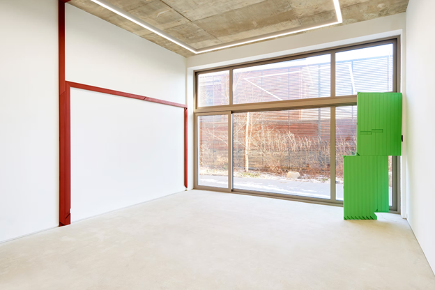 Ahra Kim’s latest exhibition has been transformational in practice. While her previous works had found motif from the colors and structures of traditional architecture–her tribute to the order and value of history–this exhibition looks to contemporary buildings. They are present and possibly even mundane. Kim previously surveyed this possible contemporaneity in her Shaped Canvas work where she combined the canvas frame with the architectural structures and colors of traditional dancheong. This latest exhibition marks an earnest crossing over into that surveyed realm.