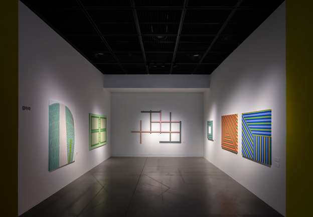 Looking back on her works so far during her participation in the Artist support program “in the Suwon Museum SIMA FARM” in 2019, she began to think of the structure itself as an architectural construct and work on a “shaped canvas” that combines with Dancheong paintigs. In the history of formalist art, the modified canvas work features to support that fits into the picture (The key is to reject the old-fashioned notion of drawing illusions on a purely flat surface, a screen perceived as a window.). However, in the history of post-war modernism in Korea, such a combination of anti-spiritual obsession and support did not occur, and an artist who achieved no success in the “Shaped Canvas” work.