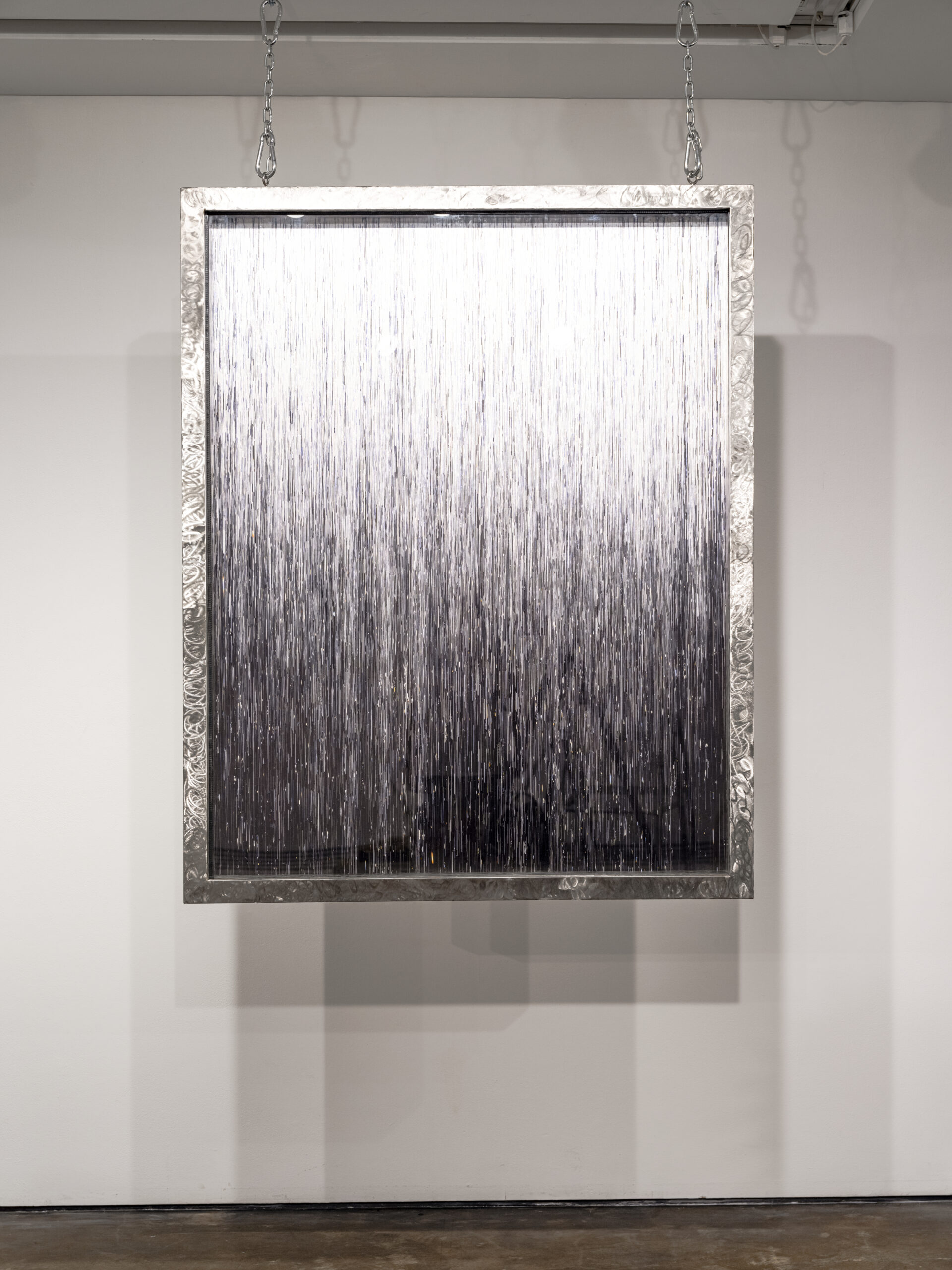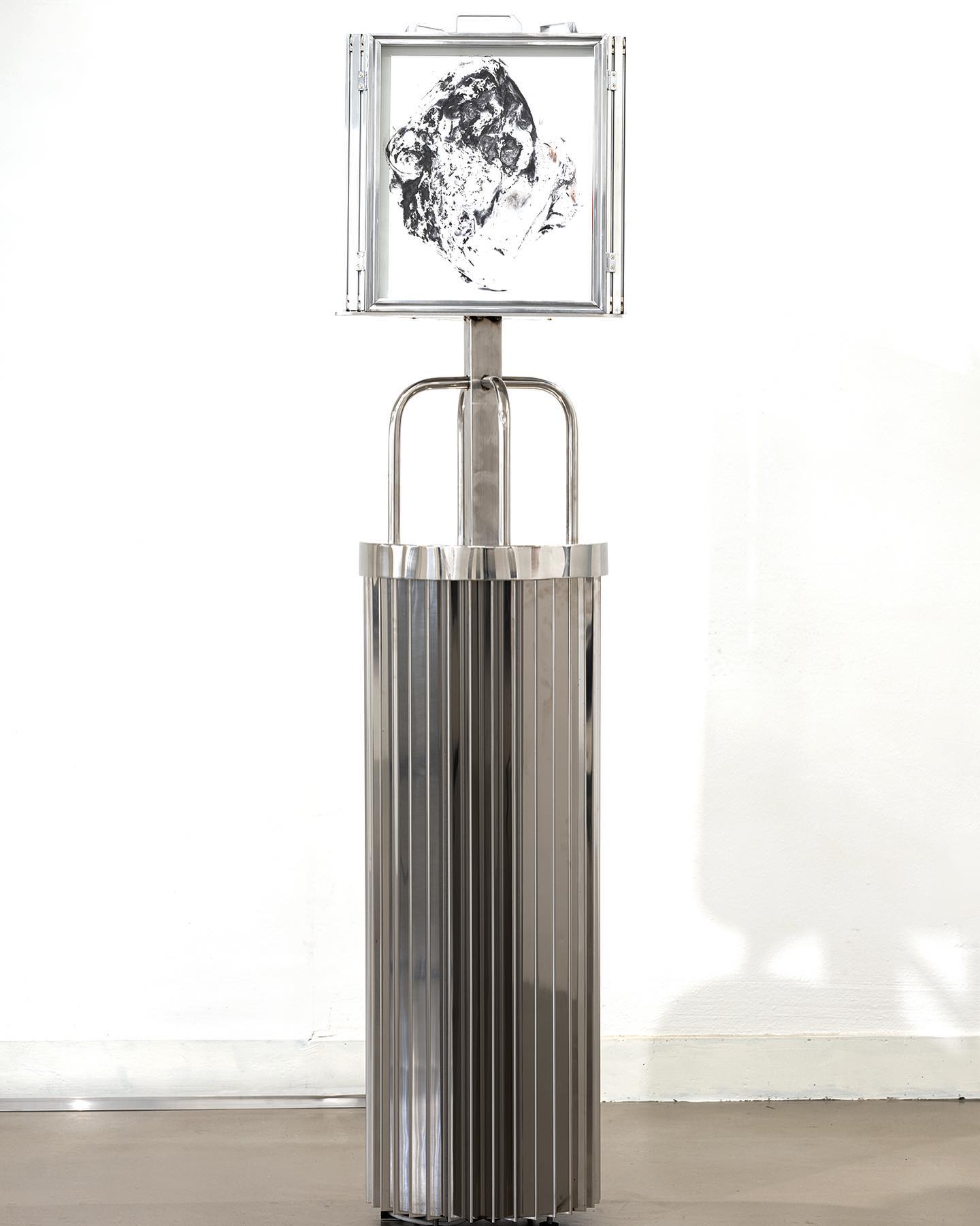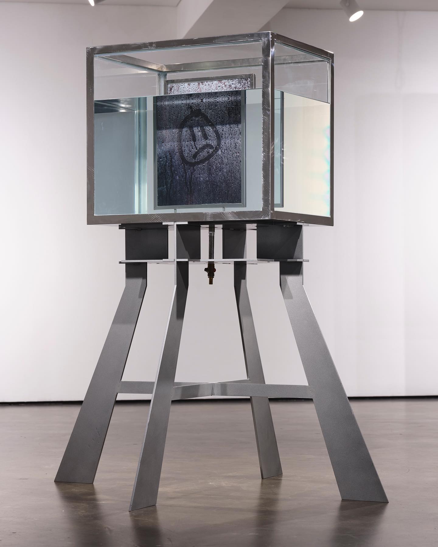In other works, Lee photographs situations in which three sculptural elements lean against one another to maintain balance, placing the resulting image within a frame equipped with four steel legs so that it can lean against either a wall or the floor. In another instance, an image of a doodle drawn with a finger on water droplets gathered on a glass window is placed inside an aquarium-like frame.