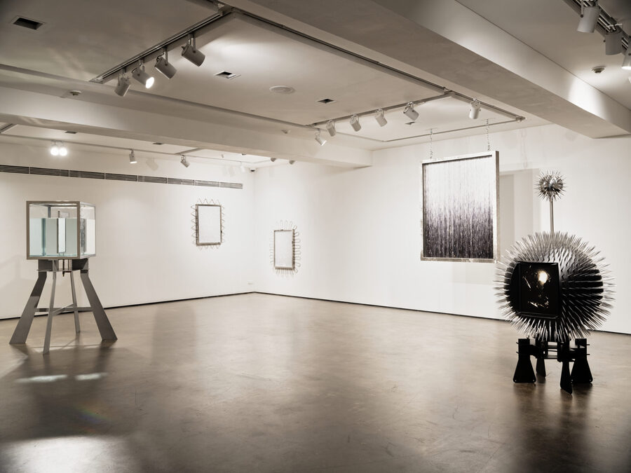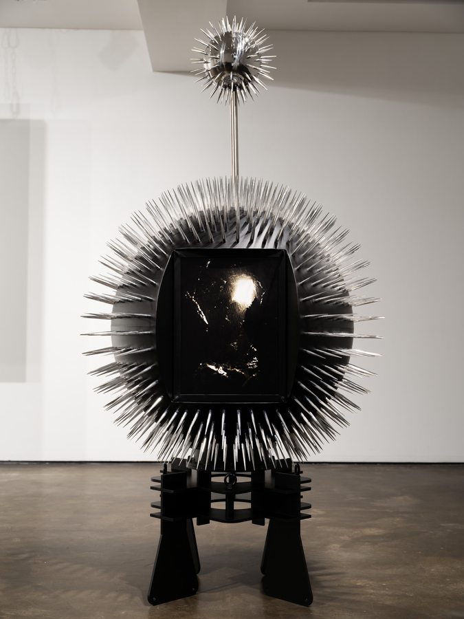 The works’ flamboyant appearances—such as spherical steel forms studded with sharp metal cones like thorns—naturally captivate the viewer’s gaze. Here, the artist draws on the theory of the “supernormal stimulus,” which describes the tendency to be more easily attracted to exaggerated versions of something than to the real thing. Lee translates this idea into frames that are more conspicuous than their contents—an ornate shell that stands out more than the photographic image itself.