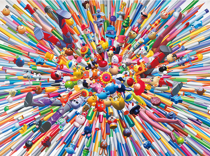 The artist fills his canvases with everyday objects such as ballpoint pens, pencils, and books—items commonly encountered in daily life—rendered in vivid colors. In the ‘Pencil’ series, dozens of pencils in various forms and colors densely populate the canvas, appearing to burst outward beyond the frame like rockets being launched, with the center evoking a dazzling festival.