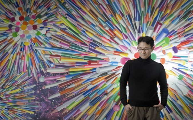 Hong Kyoungtack standing in front of his representative Pen painting. Pens are geometrically arranged across the large canvas, offering visual pleasure. © Jeon Minkyu, Monthly JoongAng Reporter