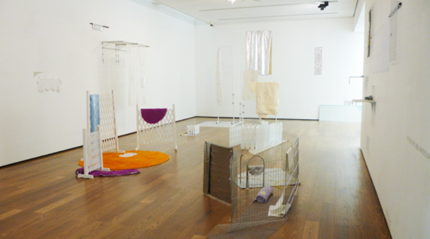 Various kinds of fences, drying racks, blankets, quilt covers, floor mats, scarves, lace, wrapping paper, and so on are gathered in groups across the walls, floor, and ceiling of the exhibition space. However, it does not feel as though these are randomly scattered throughout the space. Various everyday objects are placed in the exhibition space in specific ways, forming diverse groupings. Since there are no captions for each group, viewers cannot infer what kind of work it is simply by looking at the displayed groupings.