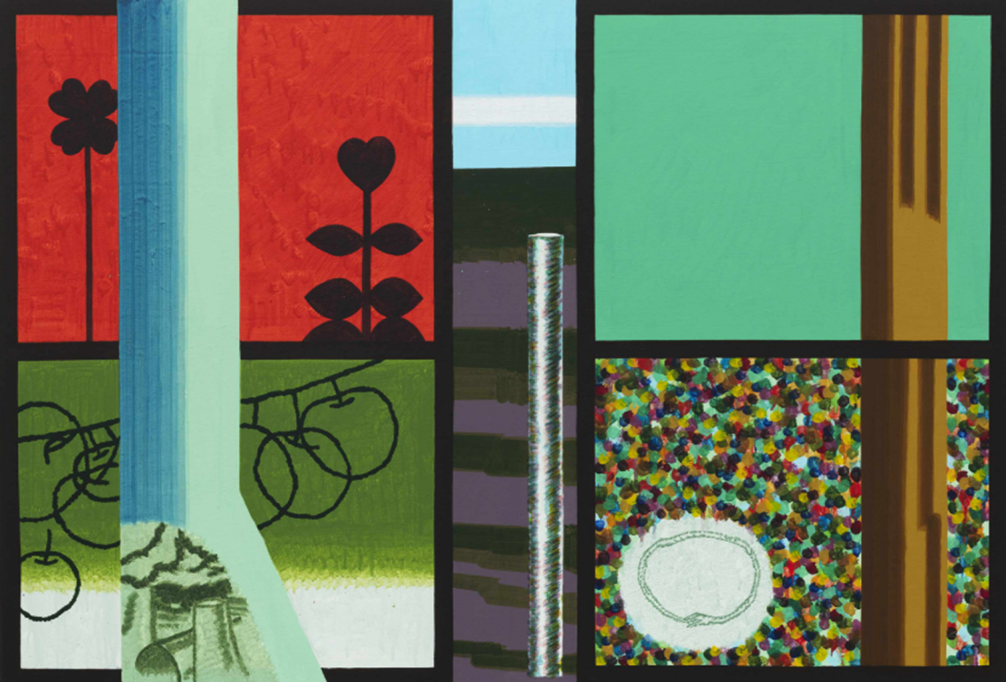 screens. On the wall, paintings in different formats are juxtaposed in a