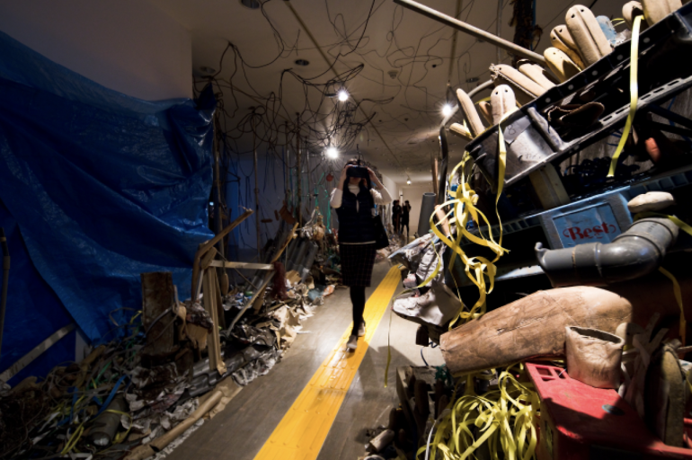 Yeondoo Jung’s Blind Perspective(2014) was first presented at his solo exhibition 《Just like the road across the world》 at Art Tower Mito in 2014 and is set against the backdrop of a village in the Mito region left in ruins by a nuclear power plant accident. The artist wandered through the actual village and installed approximately 16 tons of various debris (a shattered bathtub, a stopped clock, and so on) along a roughly 33-meter corridor constructed inside the exhibition space. Viewers walk down this corridor lined with debris while wearing a VR device called the Oculus Rift. In the actual exhibition space, viewers move through the remnants of the ruined village, yet within the VR device they encounter beautiful natural landscapes.