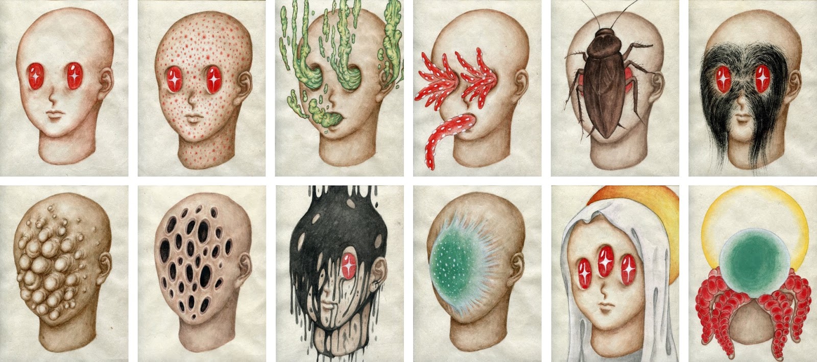 expelled like a sacred Buddhist sarira. The cartoonish faces—genderless,