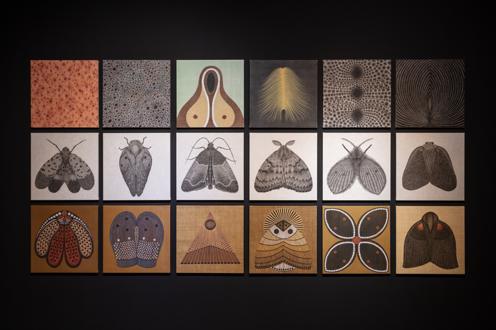 insect’s body with dazzling Buddhist paintings, and clusters of moths stuck to