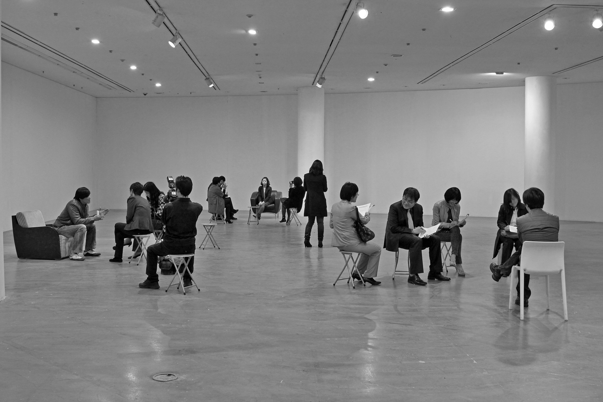 “The performers in this work come to realize that they have to respond to the reactions of the audience, rather than delivering their messages in one direction. This kind of impromptu conversation completely alienates the authentic meaning of the original and generates a new text. Here we cannot see any fixed ending. Rather, we discover a story structure that continues itself. Successive connections between artist-performer-audience, are reproductions of a politics also known as a meeting.” -Gimhongsok