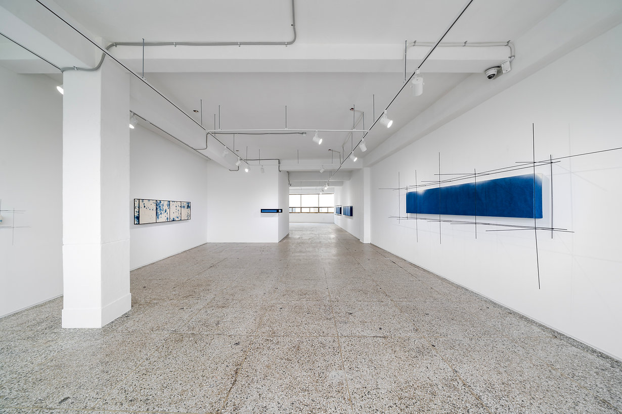 Several lines cross over a thick canvas. Viewers can see blue paints spreading on the fabric between the frame-shaped structures that divide the space horizontally and vertically. They would have to move a bit to identify what the work is all about, and then suddenly stop, encountering a moment filled with lines and planes, colors, light reflected in the work, shadows hanging on the wall, and air in between. That is their own Lagrangian point.