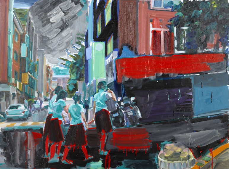 In the narrow alleyways of Bukahyeon-dong, a hillside neighborhood in Seoul, four high school girls walk along chatting animatedly. It is broad daylight, yet the sky above their heads is a deep gray. Buildings tilt precariously, and a village bus scorched by fire charges forward, cloaked in red paint.