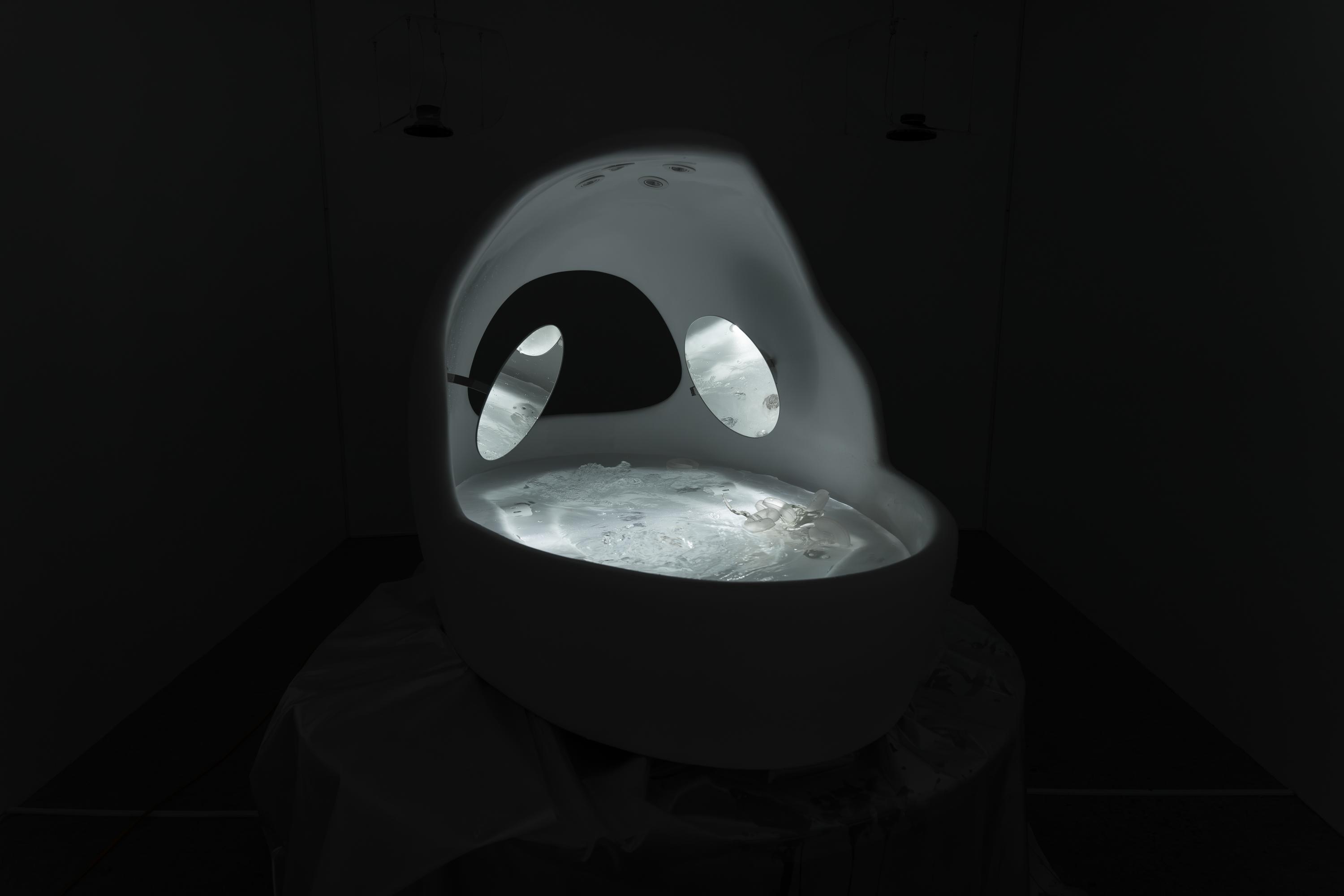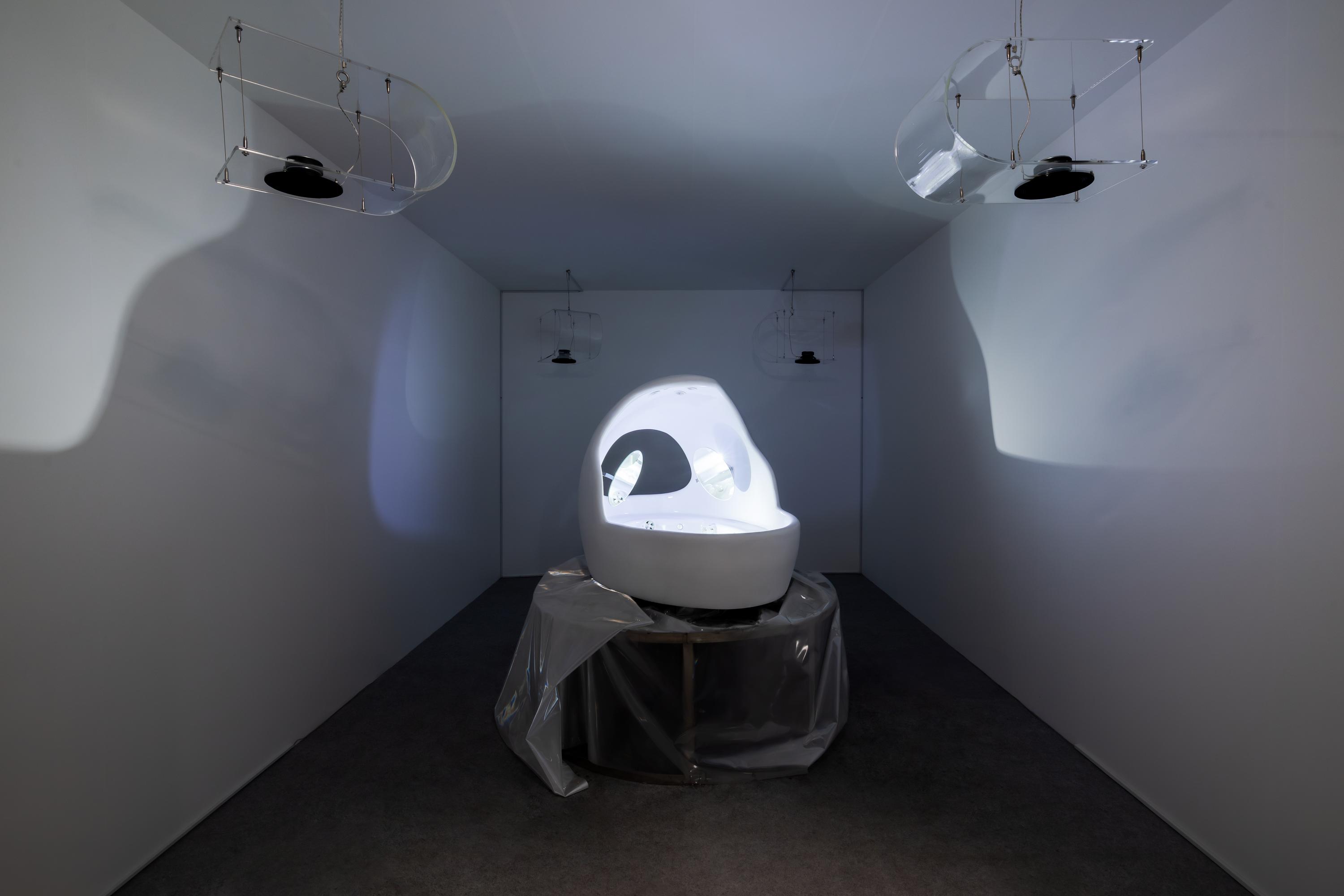 Inside the floating capsule, the body hovers in a weightless state on water maintained at skin temperature (37°C). Suspended on the water, the body escapes physical forces such as gravity and is liberated from all sensory input, including touch, sight, and hearing. Composed of more than half water, the human body in contact with water experiences a dissolution of the boundary between its interior and exterior.