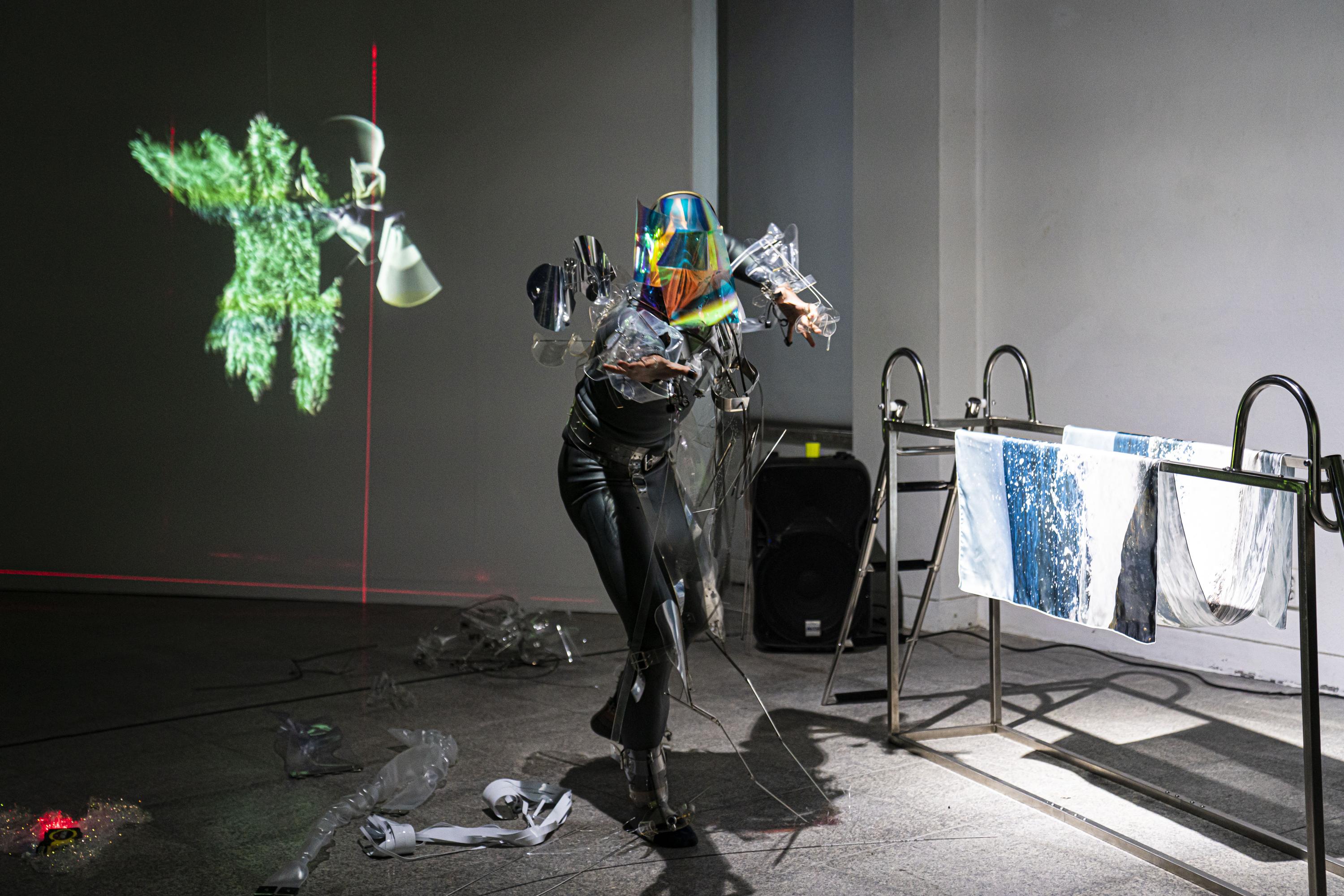 Hkason, The in between Gesture, 2022, PVC, neoprene wetsuit, metal wire, hologram film, and other mixed materials, Performance (approx. 25min), video (approx. 3min, loop) ©Hkason