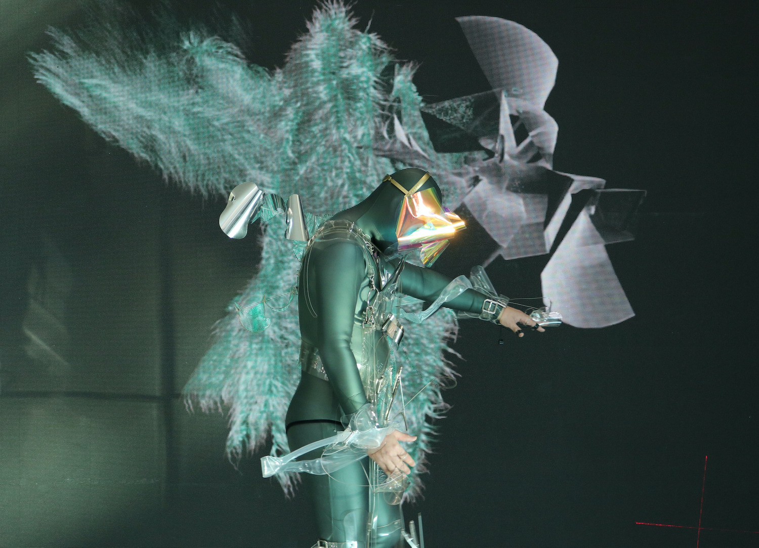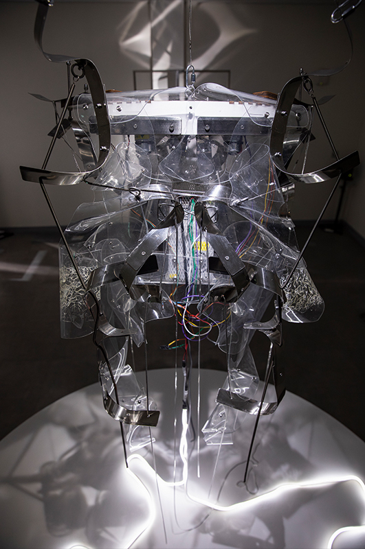 In addition, the reflective structures mounted on the body–robot exoskeleton fold inward and unfold outward in response to mechanical movements, evoking the sense of the body and space merging and generating new points of contact.