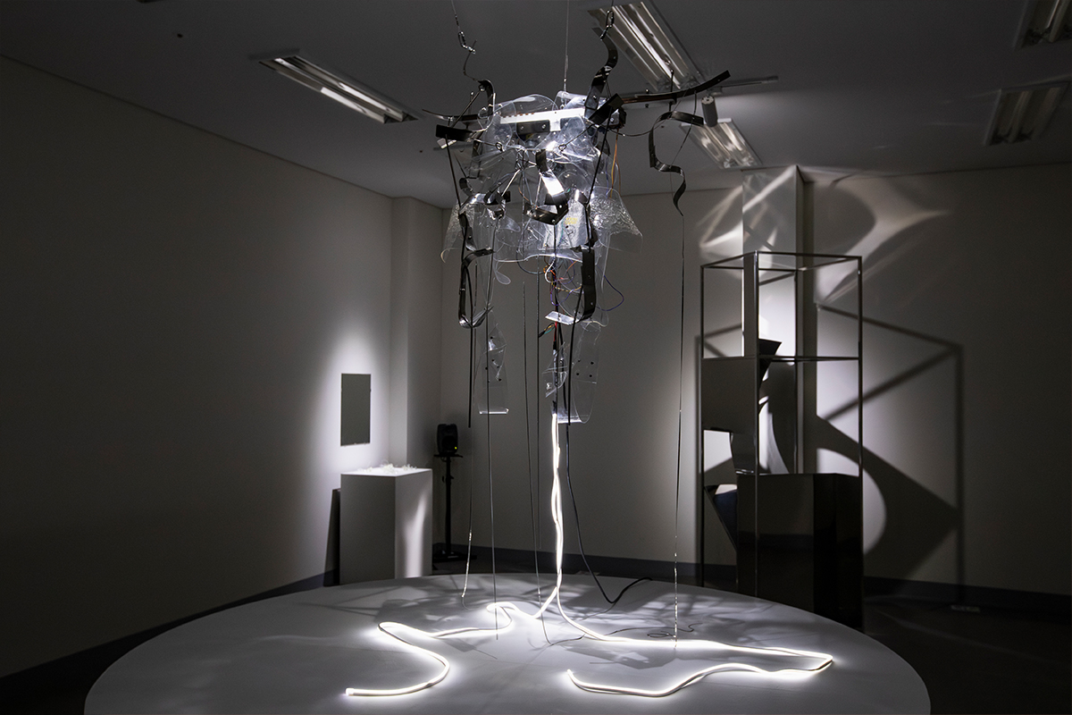 Meanwhile, the work Floating Bodily Particles (2024), presented at the Seoul Arts & Tech Festival 《Unfold X 2024》, explores the boundaries of human senses through wearable technology and a floating capsule.